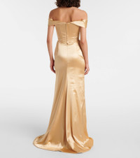 Vivienne Westwood’s designs continue to exemplify the disruptive energy of its late founder – fashion’s original punk pioneer. Made from beige satin, the Nova Cora gown features an off-shoulder neckline, intricate corsetry, and floor-sweeping silhouette. Product Details - Material: 57% acetate, 37% polyamide, 6% elastane - Care instructions: dry clean - Made in the UK - Designer color name: Sand - Item color: beige - Item number: P01048041 Size & Fit - True to size - Off-the-shoulder - Internal boned corset for support - Cinched waist - Non-stretchy fabric - The model seen in the picture is 178cm-5'10" and wearing a size UK 8