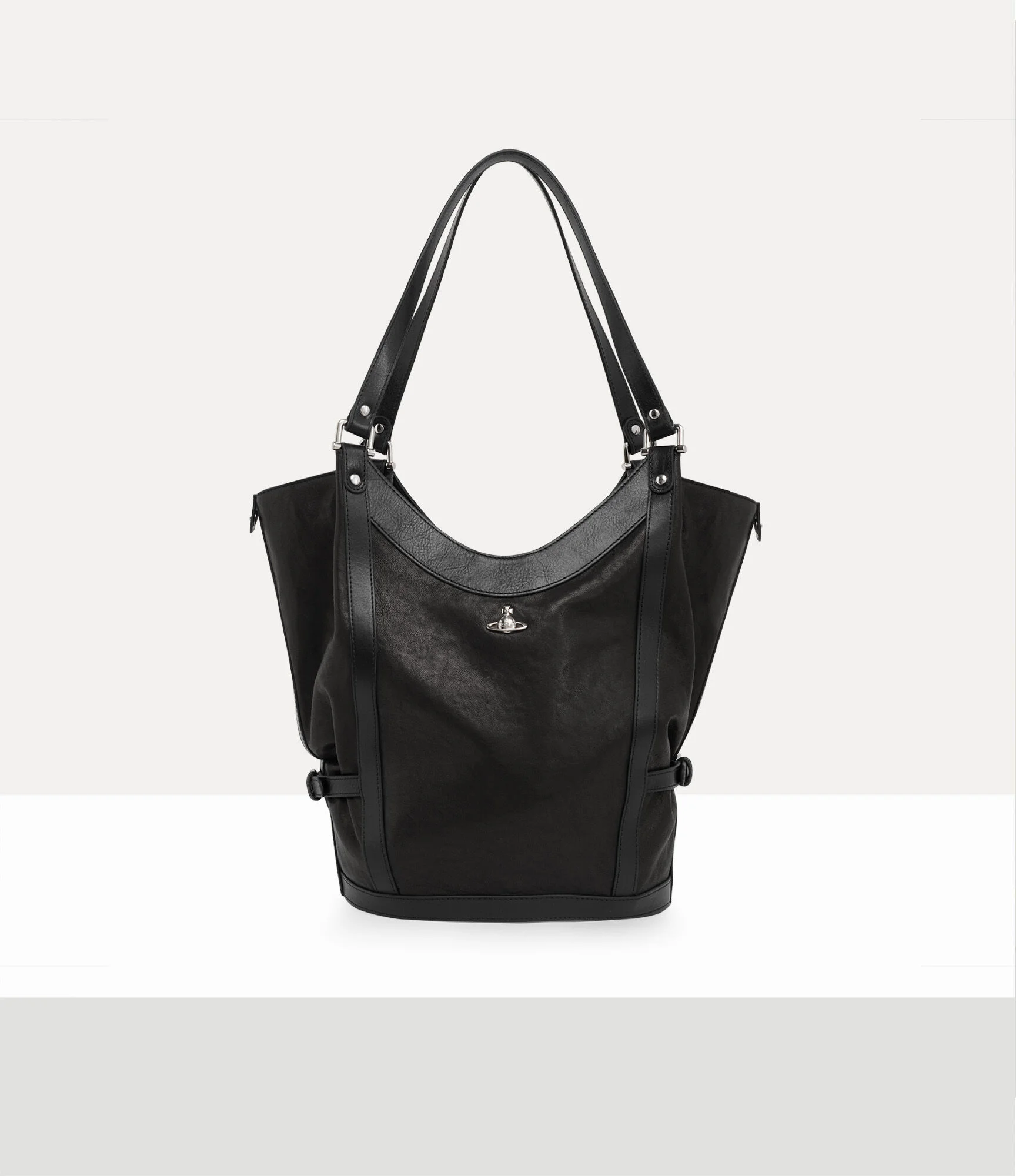 This season’s Olive Large Shoulder Bag is crafted from supple leather and lined with our signature broken pinstripe - a reimagining of the classic pinstripe pattern, first introduced in the Vivienne Westwood Gold Label Autumn-Winter 2015 collection. Its soft, slouchy silhouette is defined by tonal straps that cinch the form like a harness, echoing bondage-inspired elements in tribute to the house’s iconic Betty range. Code: 8053195235568 - Features a soft, slouchy silhouette - Oversized design - Long shoulder strap - Adjustable design - Metal hardware detailing - Orb motif - Internal pockets - Spacious interior - 'Broken Pinstripe' lining - Length 46cm, height 35cm, depth 25cm COMPOSITION - Main material: 100% sheep leather - Lining: cotton 'Broken Pinstripe' jacquard - Silver-tone plated brass hardware