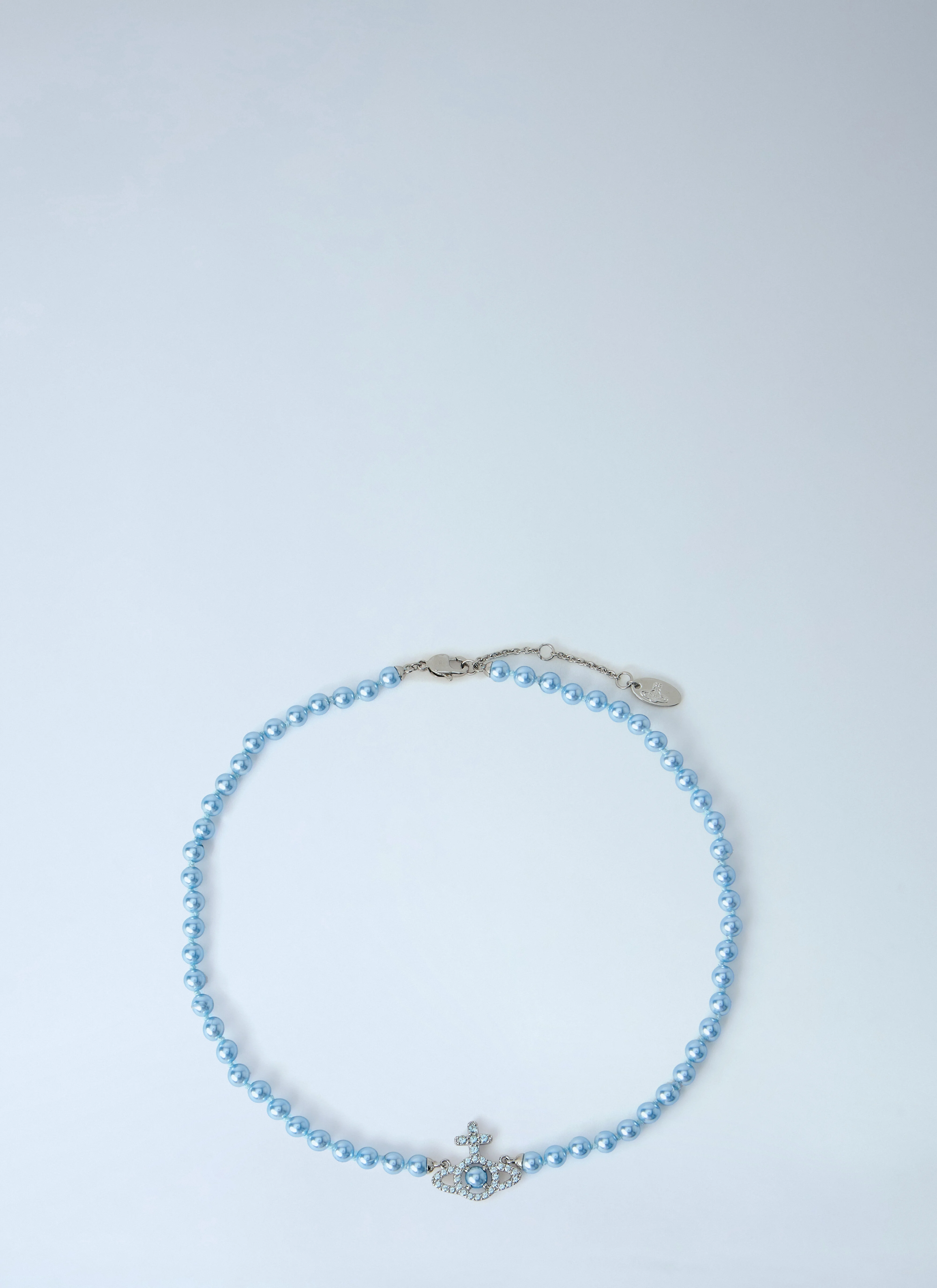Pearl necklace with orb pendant and adjustable chain. - Round pearls - Orb pendant detail - Lobster clasp fastening - 100% Brass - Color: Blue - Code: 6301011P-02P718-P718