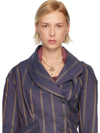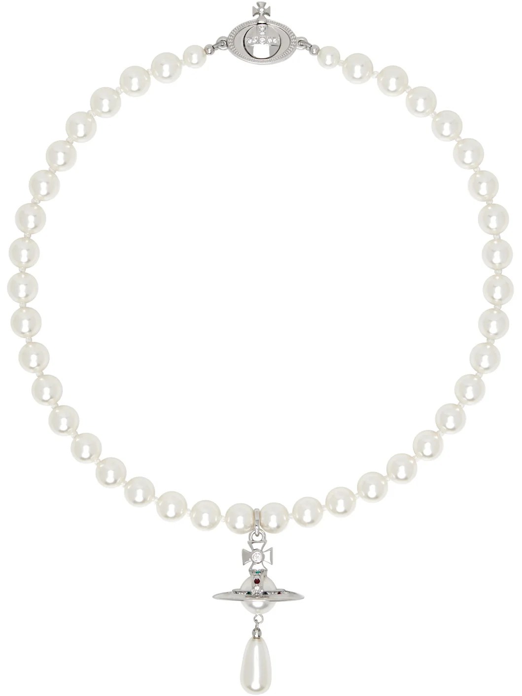 Beaded faux-pearl choker in white. · Logo pendant with crystals · Logo at flip-clasp fastening · L15" Supplier color: Platinum/Pearl/Multi Brass, crystal. Made in Thailand 252314F023008