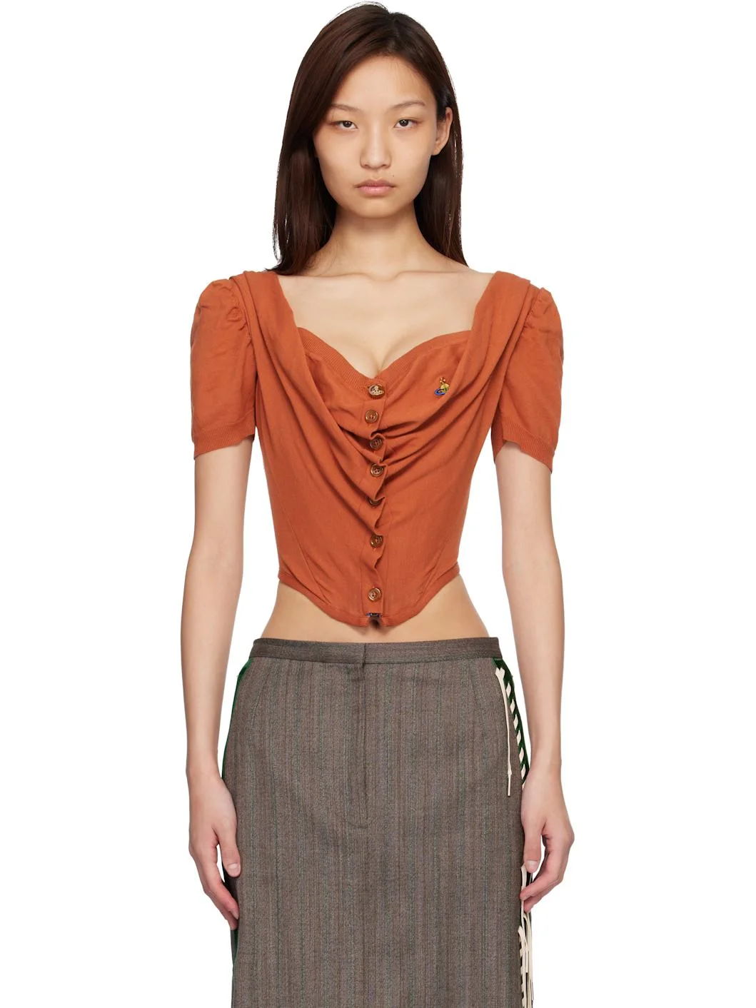 Layered knit organic cotton cardigan-style blouse. · Draping throughout · Integrated corset-style underlay with boning · Stripes at underlay · Sweetheart neck · Button and concealed zip closure · Logo embroidered at chest · Curved hem · Concealed elasticized shoulder straps · Rib-knit cuffs Supplier color: Terrarosa Body 1: 100% cotton. Body 2: 72% cotton, 23% polyamide, 5% elastane. Body 3: 77% polyamide, 23% elastane. Made in Italy 261314F107002