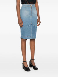 indigo blue organic cotton blend denim stonewashed front button and zip fastening dart detailing side slit rear welt pocket signature Orb logo embroidery unlined asymmetric hem Conscious: This product contains organic cotton where the cultivation and manufacturing process restricts the use of chemicals, eliminates pesticides or artificial fertilisers and incorporates methods that respect biodiversity, improve soil quality, and reduce water consumption. We've partnered with Good On You — an independent agency that rates how brands perform in relation to their impact on the planet, people and animals, with a multi-criteria rating simplified to a five points scale. In order to be awarded our conscious label, larger brands need to score a minimum of four out of five ('Good'), while smaller brands must score at least three out of five ('It's a start'). This item comes from a brand rated five out of five ('Great') by Good on You at the time it was added on FARFETCH. Please note, this is a brand-level rating and does not guarantee that this product is made with conscious materials. Learn more about what makes a product Conscious on our Conscious Criteria page Size & Fit Model Measurements: Height: 1.8 m Bust/Chest: 82.0 cm Hips: 91.0 cm Waist: 60.0 cm Model wears size 40 Fabric and Care Designer Style ID: 19030019W010G Designer Colour: K404 BLUE Composition: Outer: Spandex/elastane 1%, Organic cotton 99%; Lining: Cotton 100% Washing instructions: Machine Wash Made in Tunisia