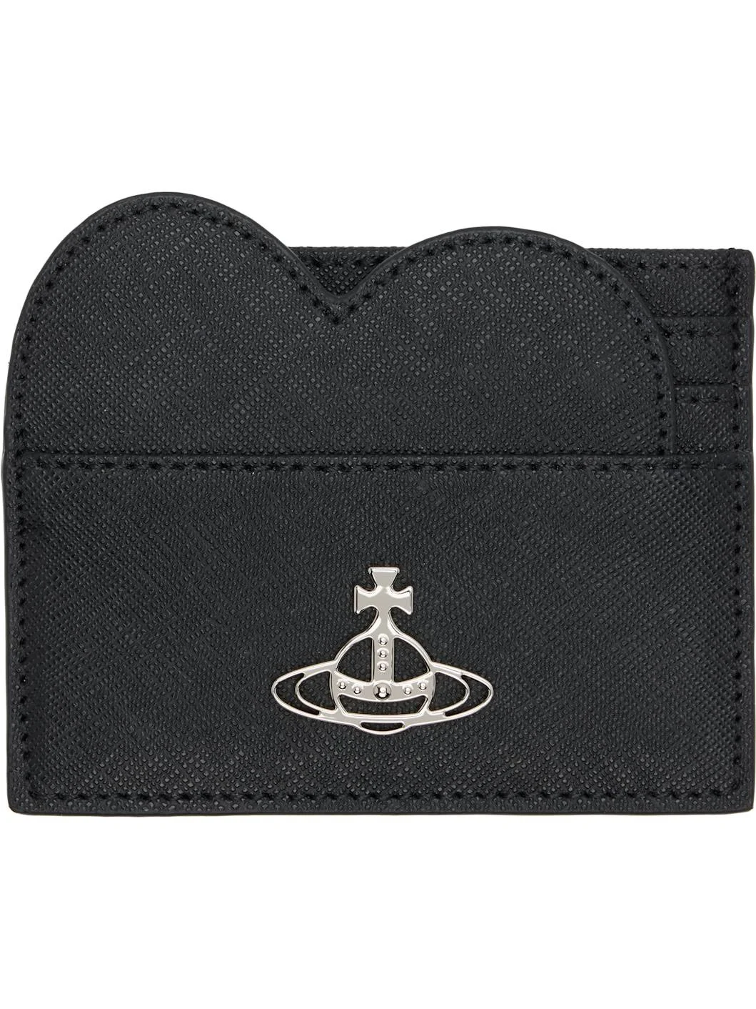 Saffiano leather card holder. · Heart-shaped applique and logo hardware at face · Four card slots · Central note slot · Twill lining · Silver-tone hardware · H3" x W4" Supplier color: Black Leather. Made in Italy 252314F037007