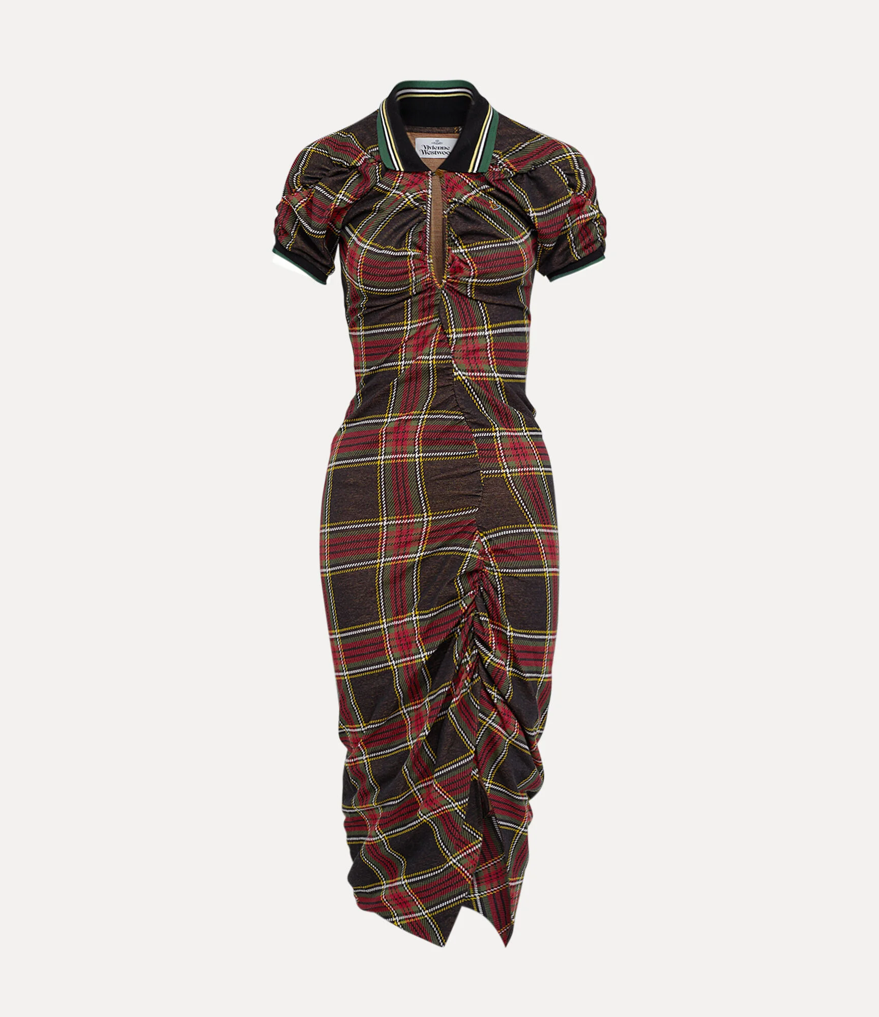 Our archive Pulling dress has been revisited this season, offered in a vibrant tartan motif - inspired by Scottish Highland regalia. The piece employs Vivienne’s original experimental 'Pulling' pattern cutting system – where the garment is draped and pulled to create form, volume, and structure. Code: 1601004S-J009T--RED-GREEN - Features a fitted silhouette - Slight stretch - Turn-down collar - Ribbed trims - Multi-coloured orb detail - Engraved amber buttons - Split detail - Asymmetric hem - Lightweight design - Model is wearing size S COMPOSITION - 100% Cotton