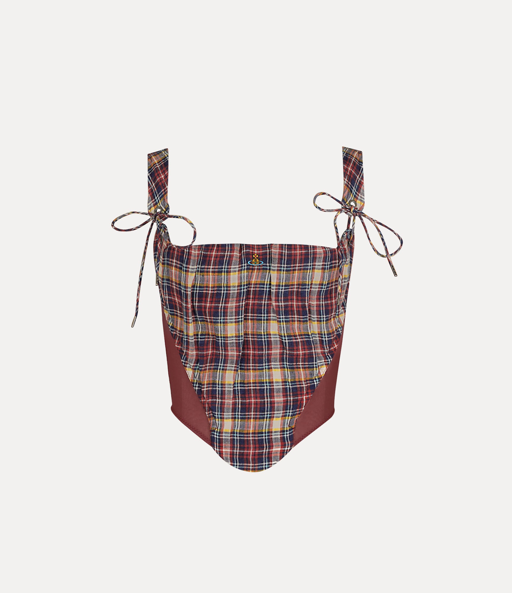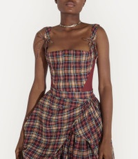 The Puppy corset is offered in this season’s linen check shirting motif, a tribute to Scottish Highland regalia. Mesh panel inserts elegantly contour the design, while self-tie details adorn the straps and a vibrant multi-coloured orb motif embroidery features at the front of the design - synonymous with Vivienne's vision of launching tradition into the future. Code: 15030047-W013R--MULTI - Features a fitted design - Eyelet details - Orb-engraved zip puller - Model is 5'9.5/177cm and is wearing a size 40 COMPOSITION - 97% Linen - 3% Cotton