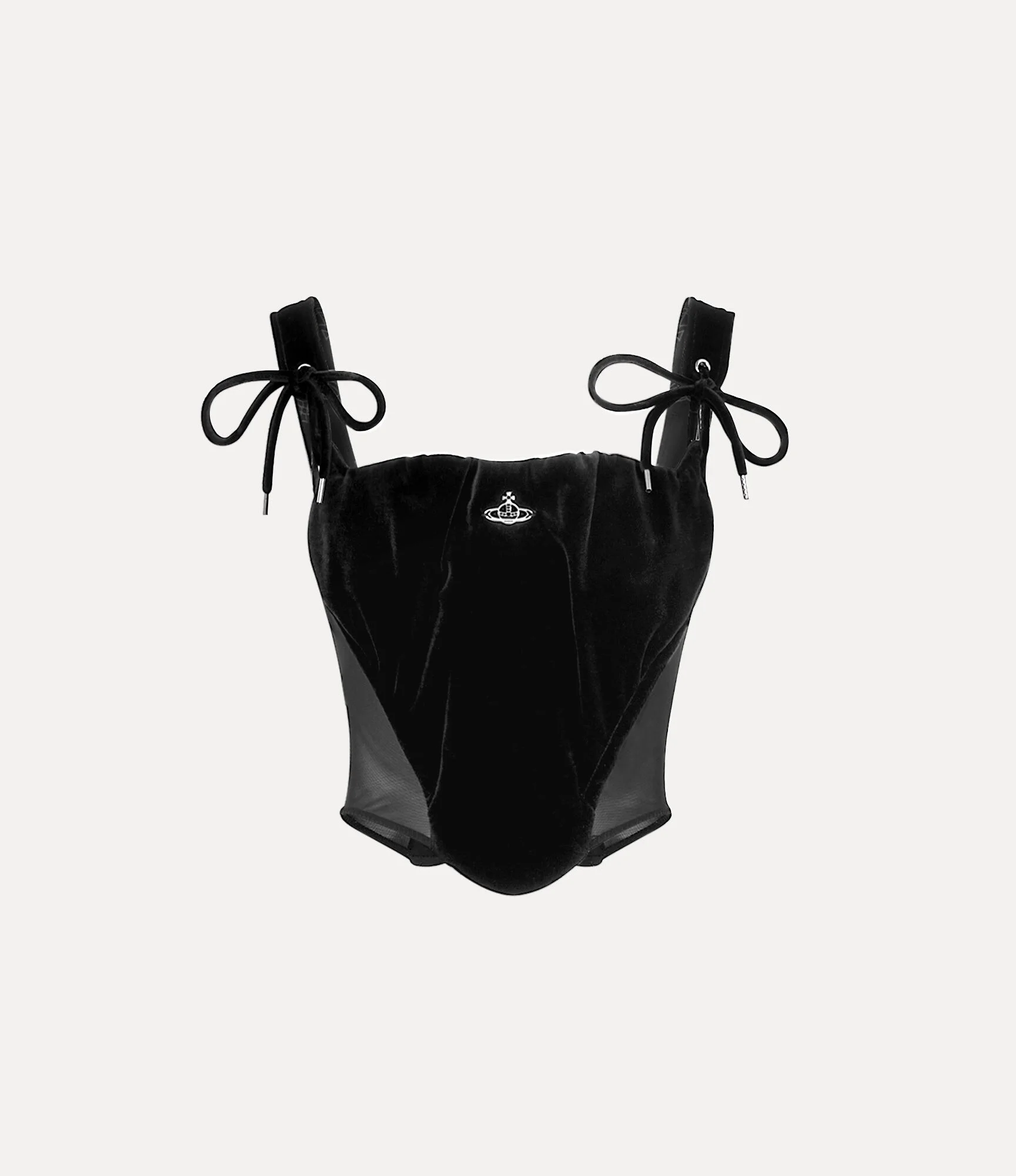 Crafted in a black velvet colourway this season, the Puppy corset is a classic Vivienne Westwood piece, defined by its cinched waist and gently curved square neckline - referencing historic 18th-century corsetry. The design is finished with a three-dimensional orb zip, evoking Vivienne’s vision of taking tradition into the future. Code: 15030047-W00WX--BLACK - Features a sculpted silhouette - Silver-tone eyelet details - Orb-engraved zip puller - 'Line Orb' motif at the front - Velvet finish - Adjustable shoulder ties - Mesh side panels - Orb-jacquard interior lining - Cropped length - Model is 5'9.5/177cm and is wearing a size 40 COMPOSITION - 100% Organic cotton - Organic fibres are natural fibres grown with strict rules concerning the use of synthetic pesticides, insecticides, or herbicides and GMOs (Genetic Modified Organisms).