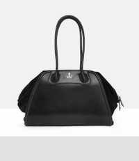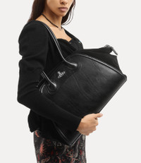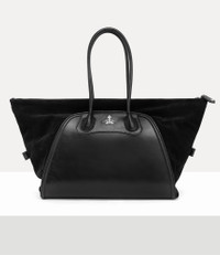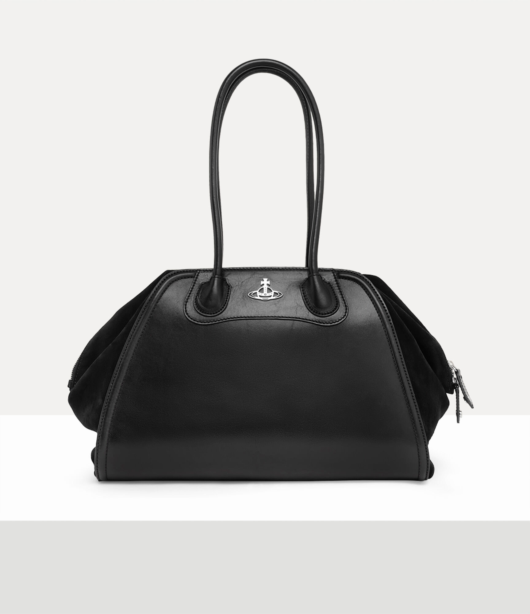 The Shirley holdall draws inspiration from the iconic Yasmine silhouette and the laid-back elegance of a picnic blanket. Crafted from smooth leather with suede gussets, its width can be adjusted using the discreet popper fastenings. The piece features the house’s signature orb emblem on the front, which represents tradition, encircled by Saturn’s rings, symbolising the future. Code: 8053195220540 - Features a top-zip fastening - Sculpted top handles - Adjustable gussets - Thick topstitching - Metal plated orb motif - Spacious interior the can hold laptops - 'Broken pinstripe' lining - Length 33cm, height 16cm, depth 10cm - Made in Italy COMPOSITION - Main material: 80% vegetable tanned cow leather, 20% calf leather - Interior lining: 100% cotton