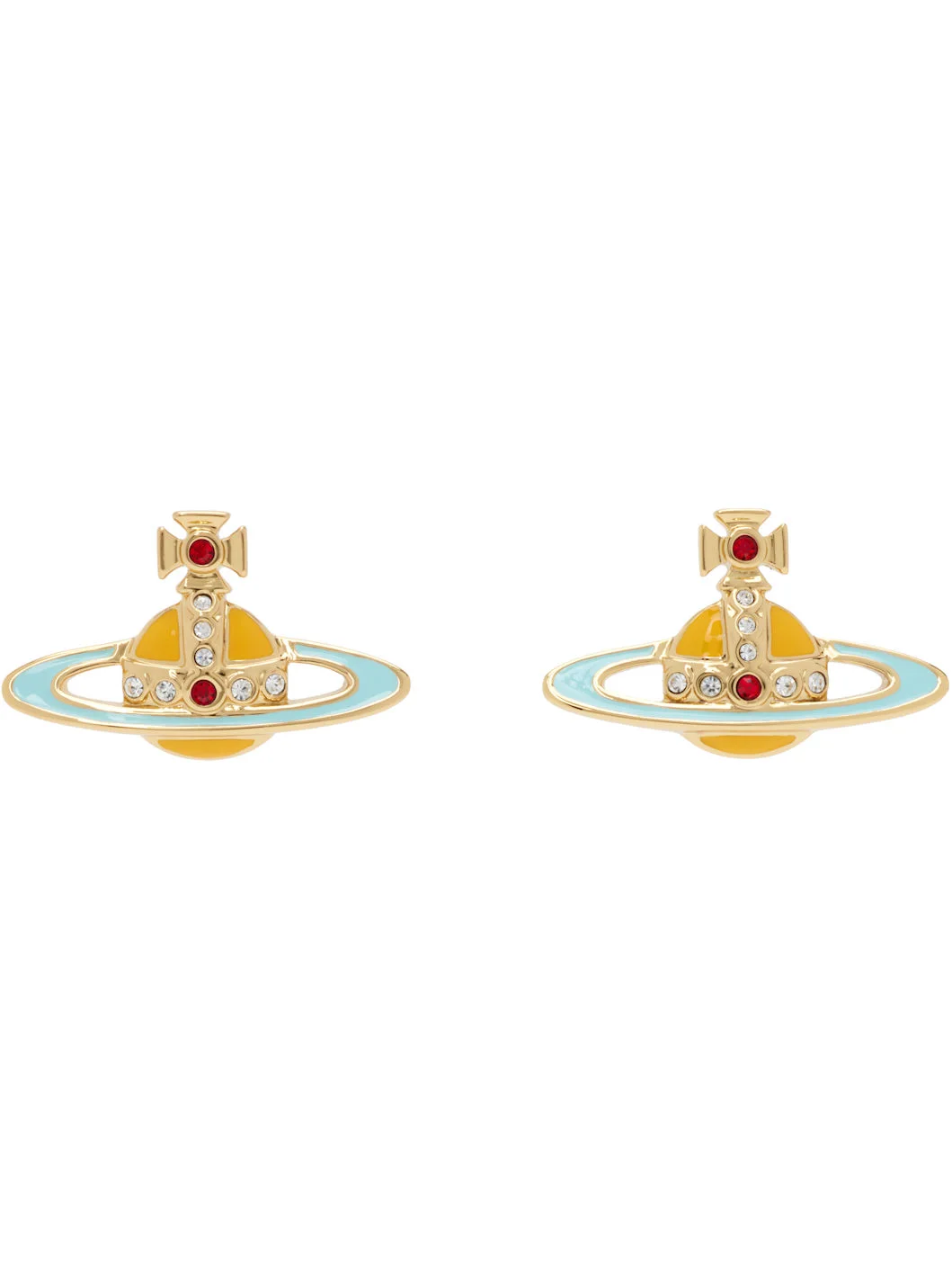 Pair of stud earrings in gold-tone brass. · Hand-enameled logo graphic with pave-set crystals · Post-stud fastening · H0.75" x W1" Supplier color: Gold/Light Siam/White/Mustard CZ/Blue Enamel Brass, crystal, enamel. Made in Thailand 261314F022068