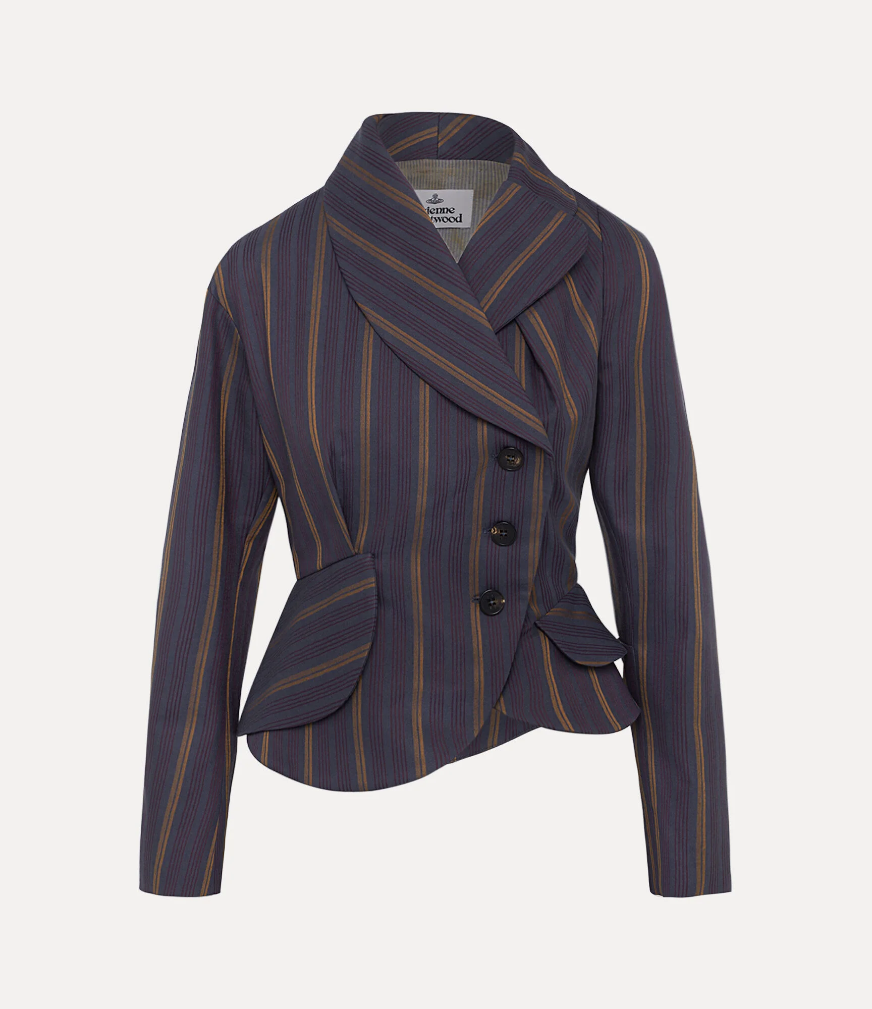 Crafted from a soft cotton blend, our Stormy jacket features a navy base with fine vertical stripes in gold and burgundy, framed by a draped shawl collar. Delicate darting shapes the waist, falling into a sculpted peplum hem, while a playful ‘Coffee Stain’ motif accents the interior. Code: 1401007S-W003P--DUSK - Features a fitted waist - Tailored silhouette - Curved front panels with sculptural shaping - Long sleeves - Darted construction - Seam detailing at the back - Model is 5'9/177cm and is wearing a size 40 - Made in Italy COMPOSITION - 98% Cotton - 2% Recycled polyester