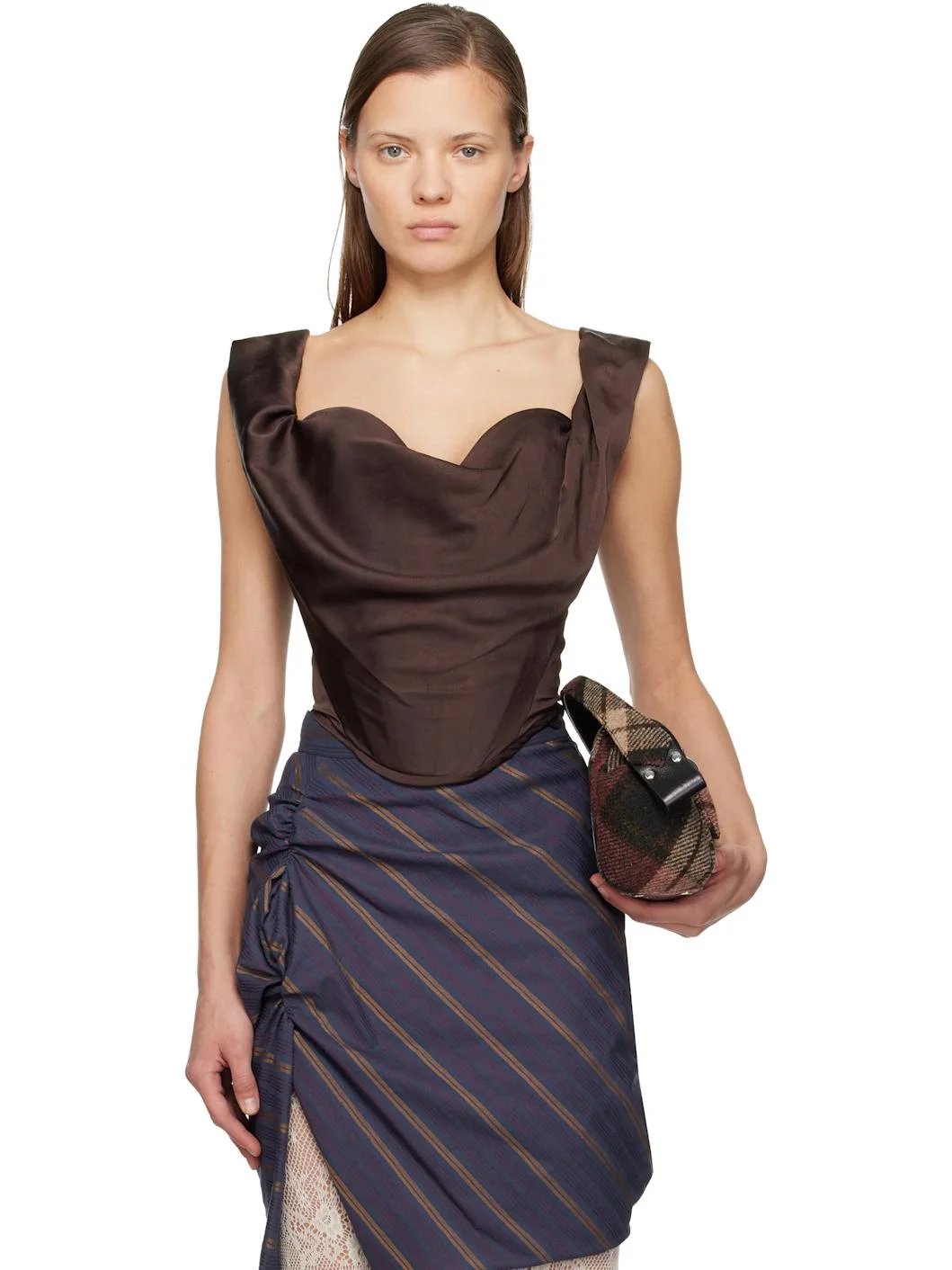 Recycled polyester satin corset-style top. · Paneled construction · Boning throughout · Sweetheart neck · Draping at front · Curved hem · Elasticized shoulder straps · Zip closure at back Supplier color: Chocolate brown Body: 100% polyester. Trim: 84% polyamide, 16% elastane. Made in Italy 252314F111017