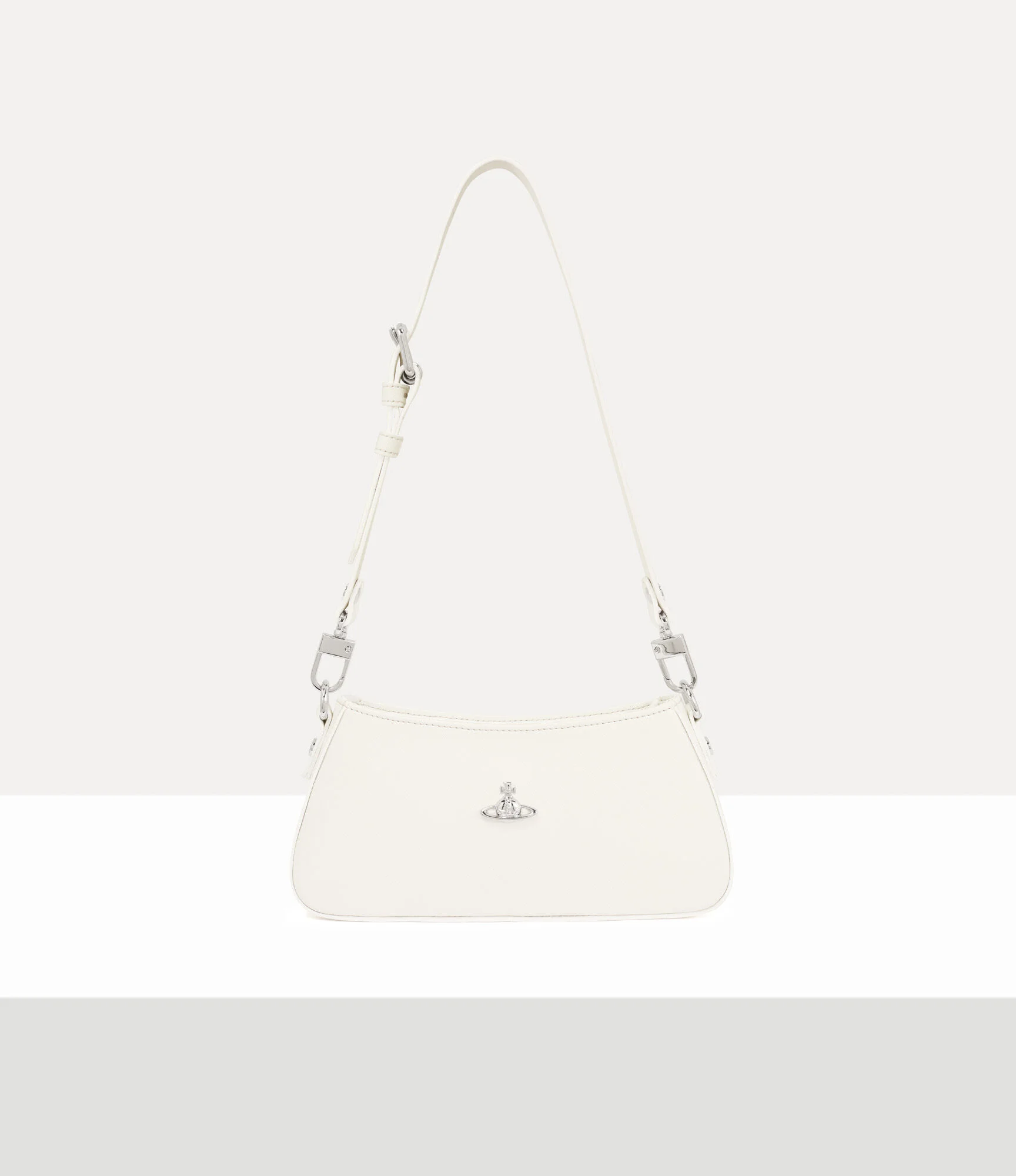 Our Tasha Shoulder Phone bag is crafted from PU leather with a saffiano-embossed texture and is adorned with the house’s signature metal hardware. At the front sits our bas relief orb motif, which represents tradition, encircled by the celestial rings of Saturn, symbolising the future. Code: 8053195450817 - Features a top-zip closure - Adjustable strap - Slim silhouette - Softly curved edges - Lined interior - Compact size - Fits smartphone and essentials - Length 23cm, height 12cm, depth 3cm - Made in Italy COMPOSITION - Main material: 65% polyurethane, 35% cotton - Hardware: silver-tone plated brass