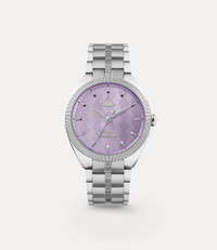 Designed with a coin-edged bezel that compliments the colourful dial, the Mew watch takes inspiration from the cobblestone streets and coloured houses of the charming London mews. Made in England Five-link bracelet Butterfly clasp Purple dial Silver-tone plating Brushed finish Hour markings Coin-edged detailing Polished case Please note that this watch comes in a gift box and has a two-year guarantee. Code: VV281TNSLXXXTNSL Details & Features Please carefully follow the care instructions in the watch case.