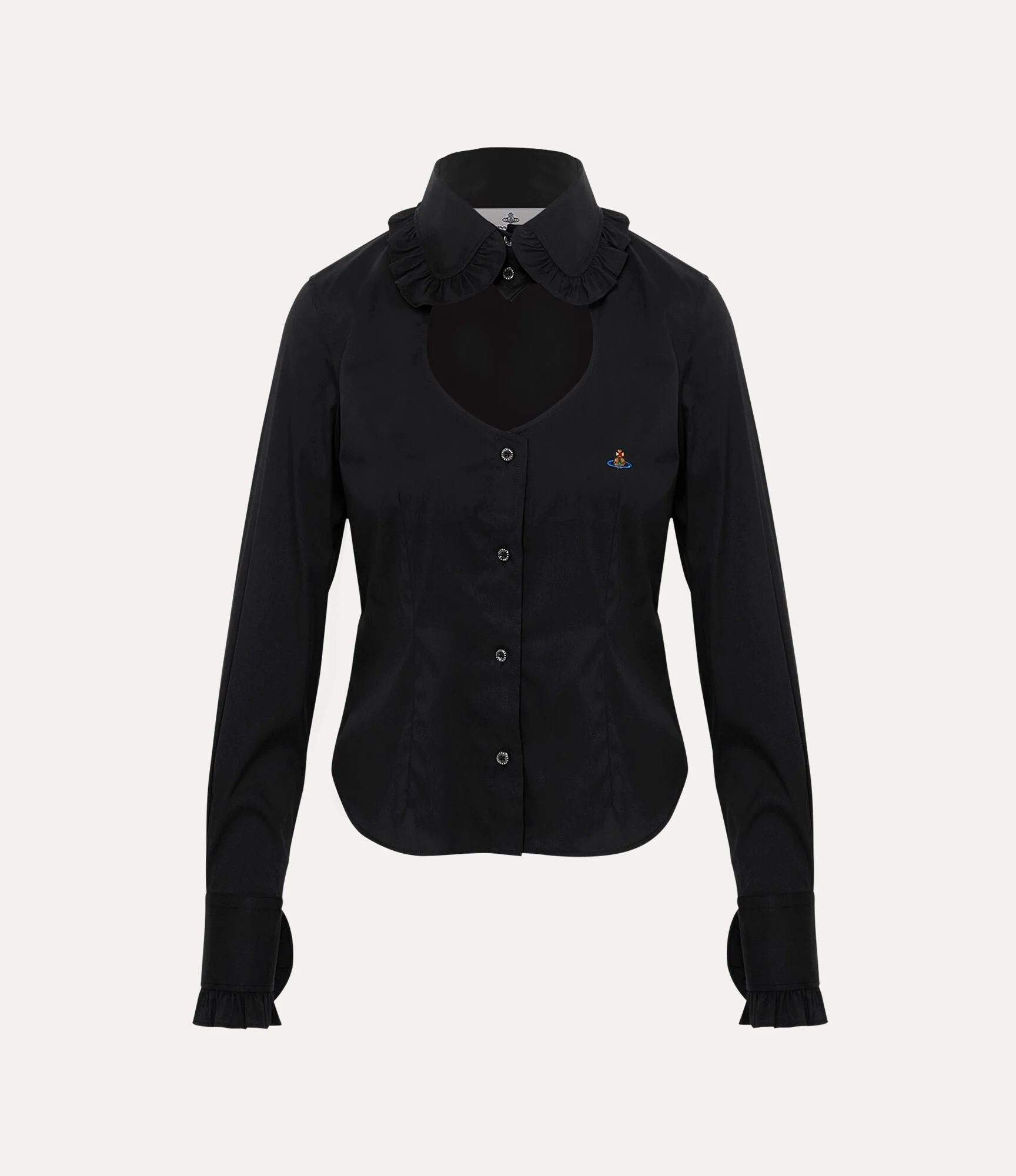 The Toulouse Frill shirt revives our archival cut-out heart tailoring at the neckline - synonymous with Vivienne's affection for both humanity and the planet. The piece is finished with our signature orb embroidery at the chest, complete with a delicately rounded collar, framed with gathered frill detailing. Code: 1501006C-W018M--BLACK - Features a classic button placket - Tailored fit - Long sleeves - Frilled cuffs - Orb embroidery - Curved hemline - Back yoke panel - Extended collar stand - Darting detailing - Tonal stitching COMPOSITION - 72% Organic cotton - 24% Polyamide - 4% Elastane