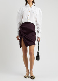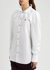 Info & Care Vivienne Westwood cotton shirt Stand collar with ruffled trim, dropped shoulders, button-fastening cuffs, signature orb embroidery, side splits, curved hem Button-fastenings through front 100% cotton Machine wash Size & Fit Length shoulder to hem: 31 inches/ 79cm Midweight Loose;fit Model is 5'10"/ 178cm and wears a size IT40