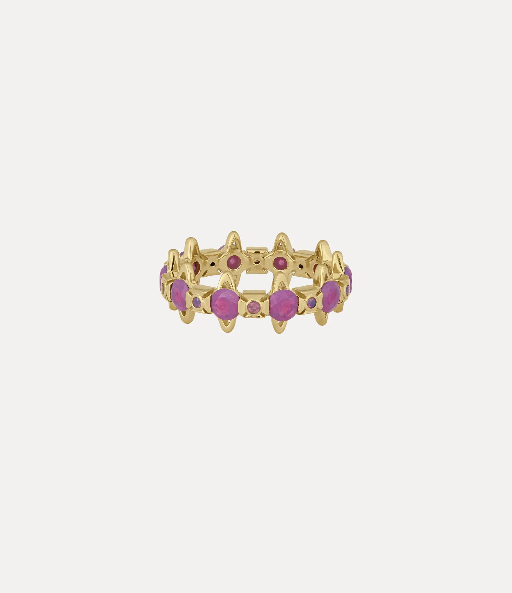 Our Warwick ring offers a sleek recycled silver design, featuring a band of interconnected orb details in a polished, gold-tone plating. The piece is designed with purple crystal embellishments at the centre of each orb, complemented by small gemstones mounted into the cross top. Code: 64040169-01R947--GOLD-MILKY-PURPLE-CZ - Features a polished finish - Band of interlinking orb motifs - Lightweight design - Cut-out detailing - Hallmark along the inner band - Weight: 1.31g - Width: 1.7cm COMPOSITION - Main material: 100% recycled silver - Cubic zirconia crystals - We plate all our sterling silver products, as this prevents tarnishing and increases durability.