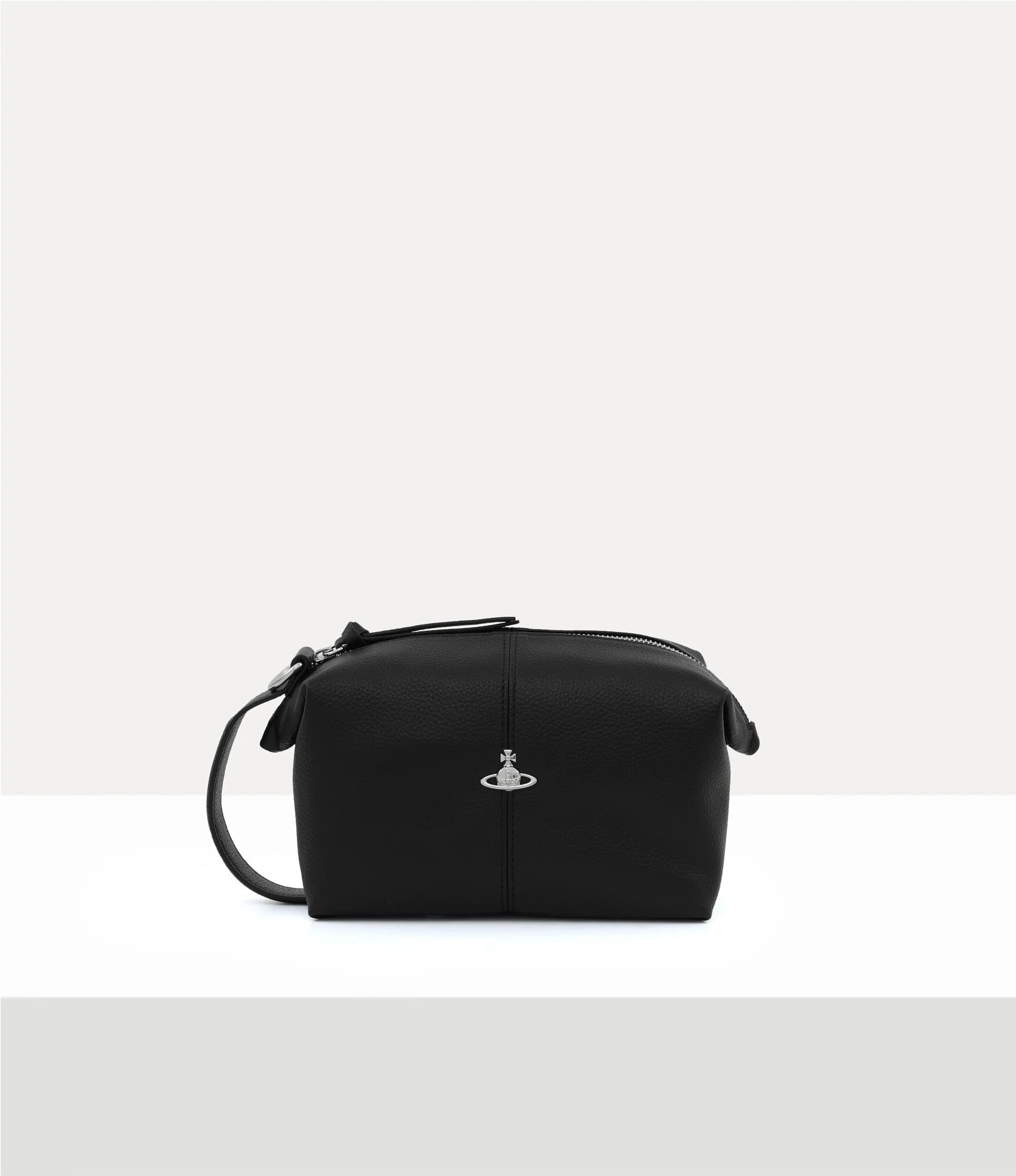 Our wash bag is crafted from PU leather and embossed with a natural grained texture across its rectangular silhouette. Designed with a softly structured profile, the piece opens to a spacious interior and is finished with a three-dimensional silver-tone orb emblem on the front, recalling Vivienne's vision of launching tradition into the future. Code: 8053195384266 - Features an all-over grained texture - Soft, structured silhouette - Top-zip fastening - Silver-tone hardware - Central seam detailing across the front panel - Signature metal orb emblem - Side handle - Polished D-ring attachment - Ideal for storing grooming essentials or travel accessories - One size - Length: 22cm, height: 14cm, depth: 12cm - Made in Italy COMPOSITION - 100% Polyurethane