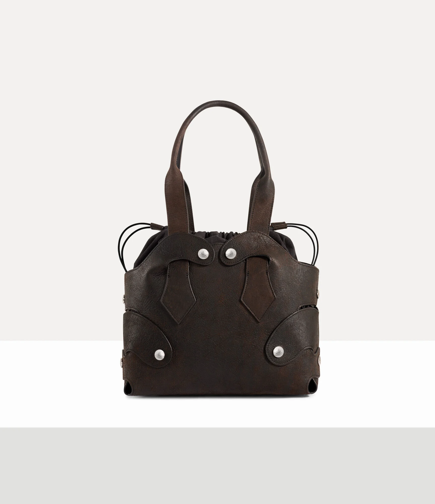 The Wilma Small tote is crafted from soft leather and employs a no-waste cutting technique, first developed for the Autumn-Winter 2007 ‘Wake Up Cavegirl’ collection. Inspired by our archival Flintstone bags, the piece features a modular popper system and signature spearhead handles threaded through the outer shell. Code: 8053195381791 - Features polished hardware - Drawstring closure - Orb-engraved detailing - Structured base - Compact size - Soft, structural finish - Length: 30cm, height: 22cm, depth: 16cm - Unisex - Made in Italy COMPOSITION - 100% Lamb leather