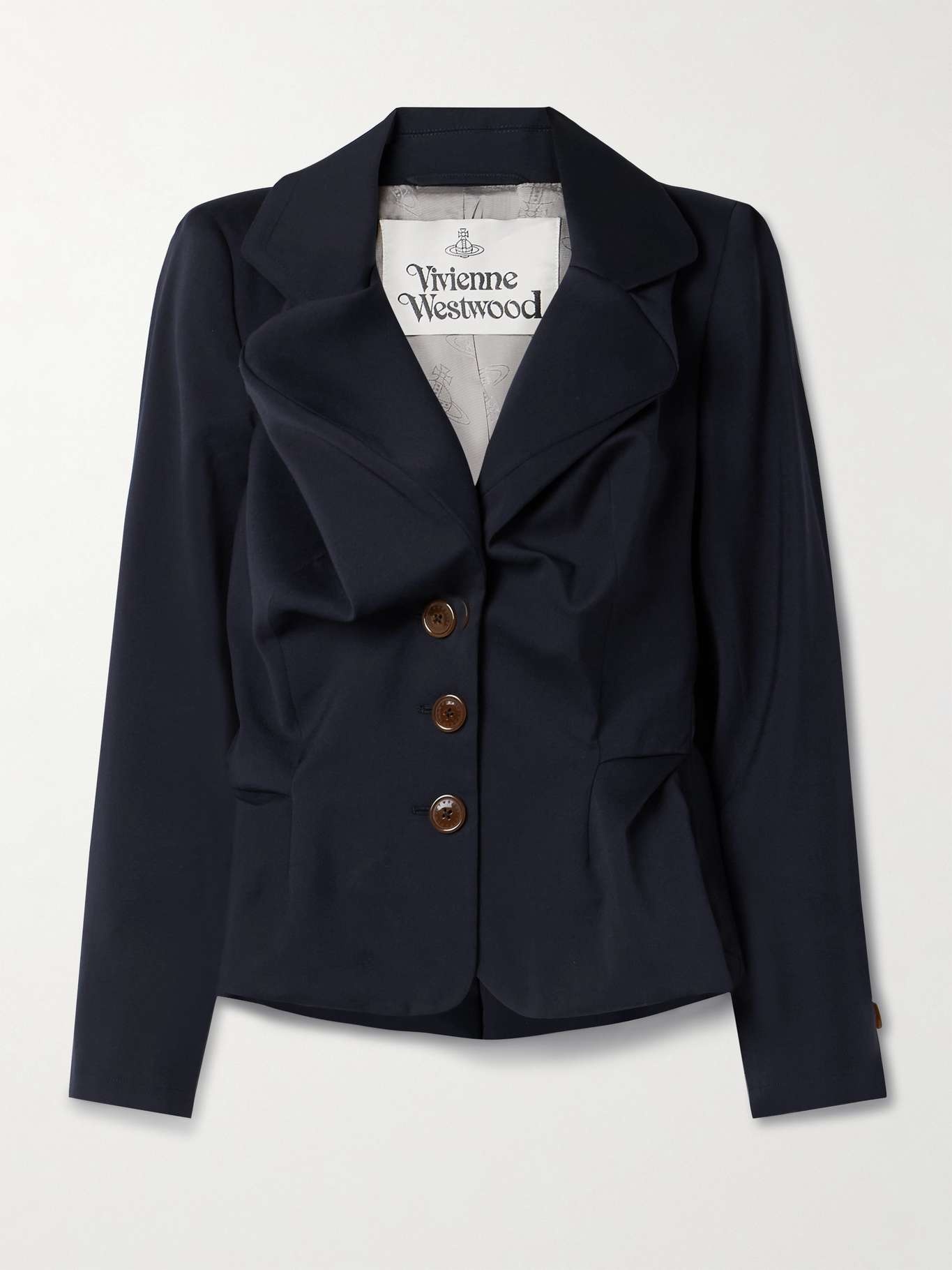 EDITORS'NOTES Vivienne Westwood's jacket is thoughtfully and intentionally gathered to create a distinct shape. It's made from wool-twill and has rounded, dimensional lapels and padded shoulders for an element of structure. The satin lining ensures it layers smoothly. SIZE & FIT Model measurements: - Fits true to size, take your normal size - Tailored for a slim fit - Internal shoulder pads - Mid-weight, non-stretchy fabric - Model is 177cm/ 5'10" and is wearing an IT 40 - Bust: 80cm/ 31.5" - Waist: 60cm/ 23.5" - Hip: 89cm/ 35" DETAILS & CARE - Navy wool-twill - Button fastenings through front - 100% wool; lining: 100% viscose - Dry clean