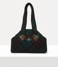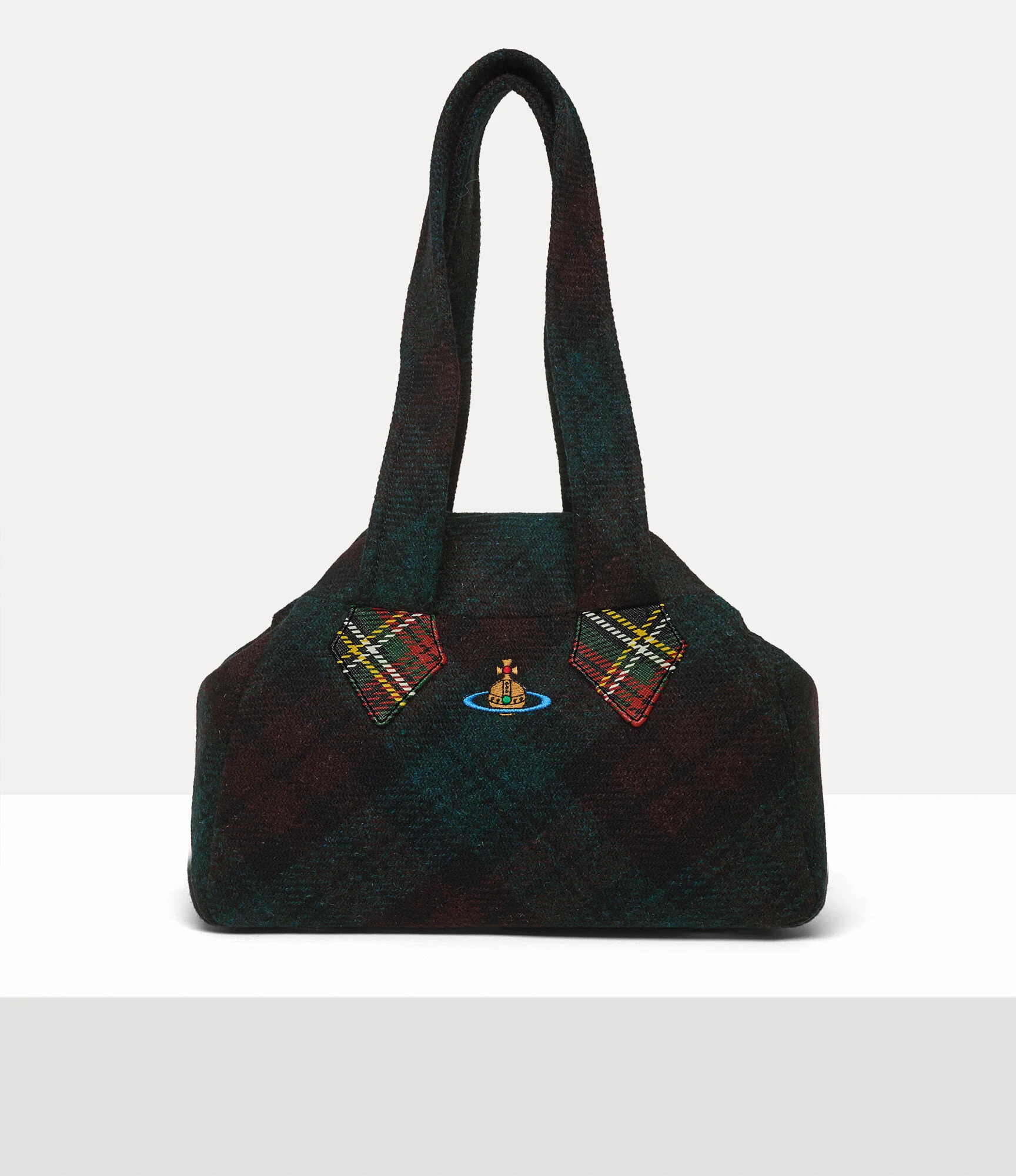 Our Yasmine Medium Archive handbag is crafted from archive Harris Tweed, hand-loomed by the inhabitants of the Scottish Outer Hebrides Islands of Harris and Lewis. The softly structured silhouette is embroidered with our signature multi-coloured orb, while the interior features the classic Union Jack lining - a tribute to the Autumn-Winter 2002 ‘Anglophilia’ collection. Code: 8053195317394 - Features a soft structure - Boxy silhouette - Diagonal panel construction - Top-handle design - Press-stud closure - Orb embroidery - Metal base studs - Woven brand label at the side - Length 21cm, height 29cm, depth 12cm - Made in Italy COMPOSITION - Main material: 100% virgin wool, crafted from certified Harris Tweed® - Lining: 100% cotton - Harris Tweed® wool is a legally protected fabric, handwoven in the Outer Hebrides from pure virgin wool that is dyed and spun on the islands. Crafted by skilled artisans, it embodies generations of expertise, quality, and tradition.