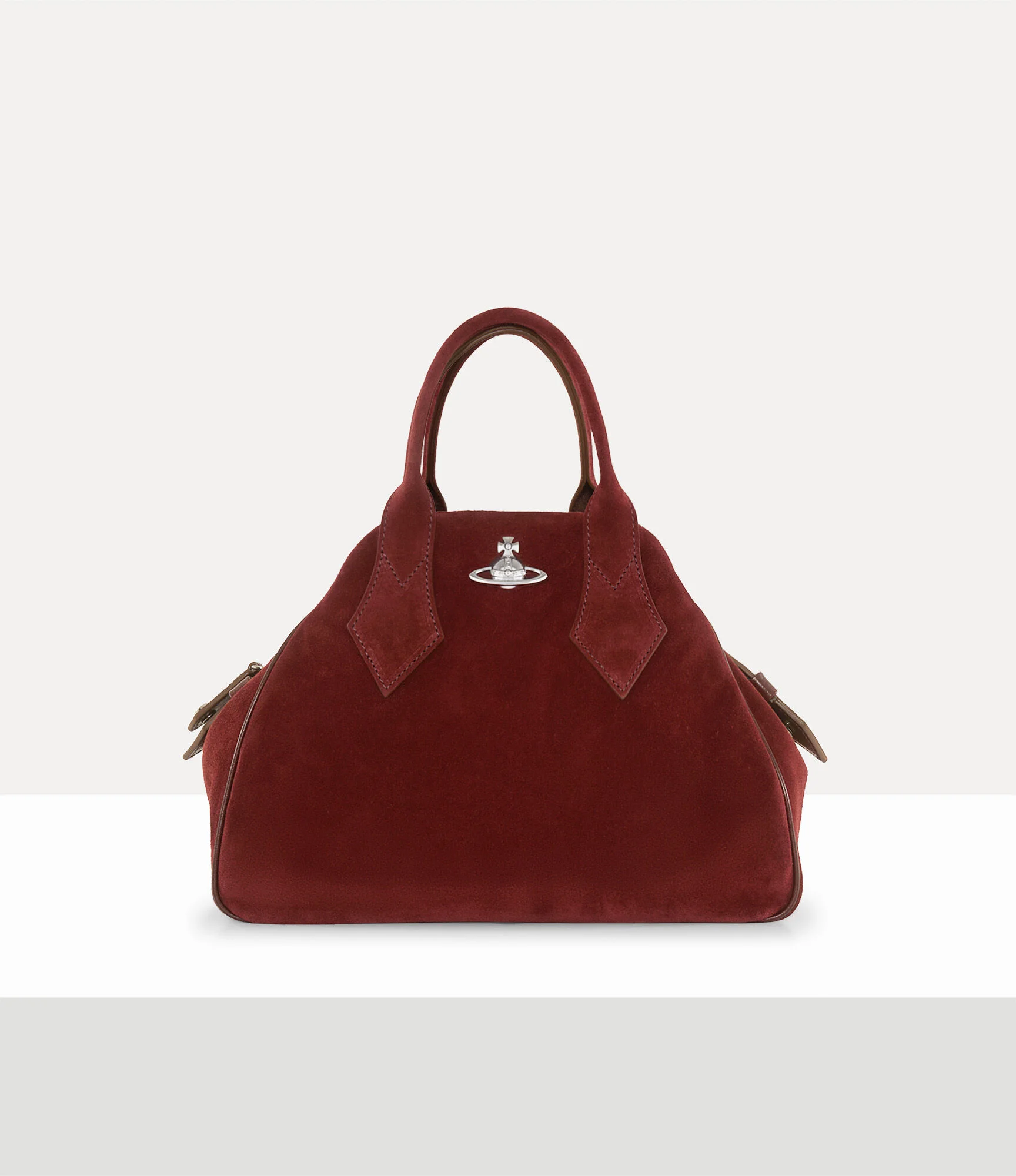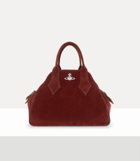 Named after French designer Yasmine Eslami, who worked with the house in the 1980s, the Yasmine Medium bag is reimagined with a suede leather profile. The signature silhouette receives our signature 'Broken Pinstripe' lining, a unique twist on the traditional pinstripe pattern, first seen in the Vivienne Westwood Gold Label Autumn-Winter 2015 collection. Code: 8053195304721 - Features a top-handle silhouette - Three-dimensional orb motif - Tonal stitching - Top-zip fastening - Fully lined - Broken pinstripe lining - Length 21cm, height 29cm, depth 13cm - Made in Italy COMPOSITION - Main material: 100% calf leather - Interior lining: 100% cotton - Silver-tone plated brass hardware