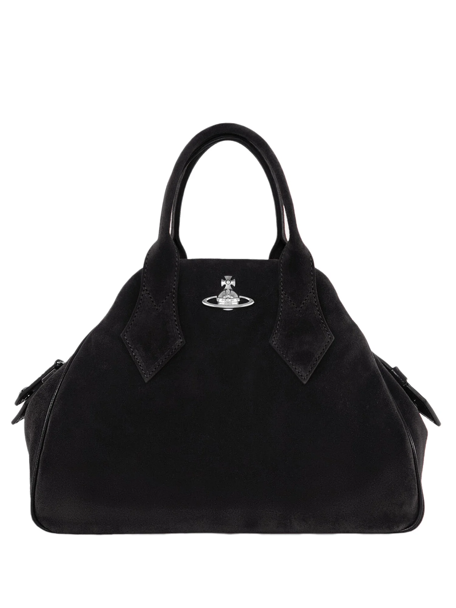 Yasmine Medium Bag in Black from Vivienne Westwood Highlights - black - features a top-handle silhouette - three-dimensional orb motif - tonal stitching - top-zip fastening - broken pinstripe lining - smooth leather trims - length 21cm, height 29cm, depth 13cm Made in Italy Designer ID: 4702000UW-L007E Colour ID: N401 BLACK Materials 100% Calf leather
