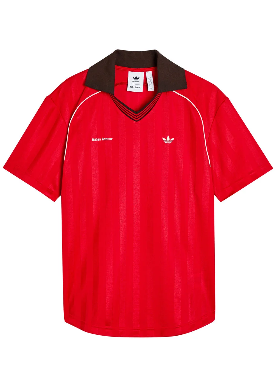 Info & Care Adidas X Wales Bonner jersey;football T-shirt Subtle striped jacquard, contrasting collar, striped neckline, logo embroidery at chest, piped trims Slips on 100% recycled polyester Machine wash Size & Fit Length shoulder to hem: 25 inches/ 63.5cm Midweight Relaxed fit Model is 5'9"/ 175cm and wears a size small;