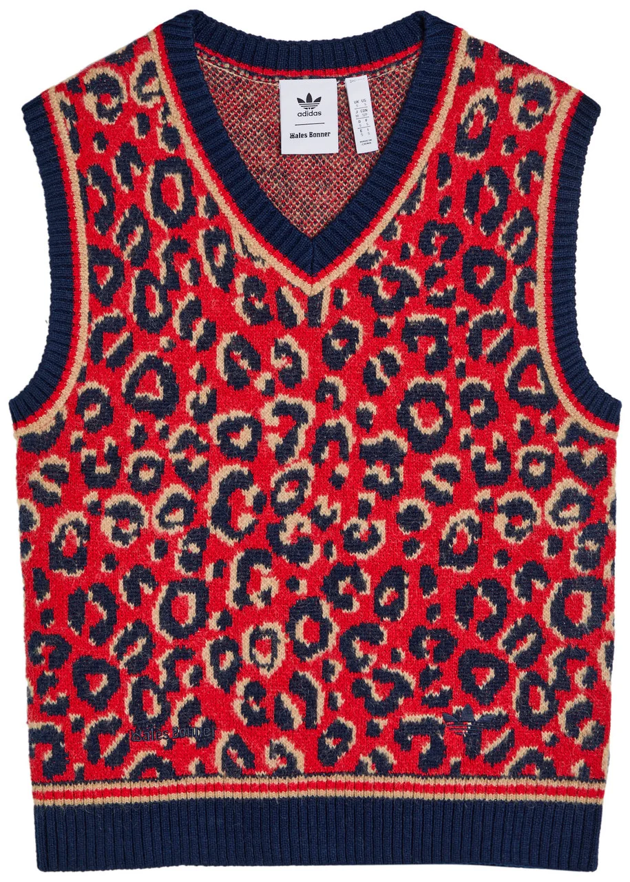 Info & Care Adidas X Wales Bonner knit vest Leopard intarsia, V-neck, logo embroidery at hem, striped ribbed trims Slips on 52% recycled polyester, 18% wool, 13% rayon, 10% angora wool, 6% recycled polyamide, 1% spandex Hand wash Size & Fit Length shoulder to hem: 21 inches/ 53.5cm Midweight Slim fit Model is 5'9"/ 175cm and wears a size small;
