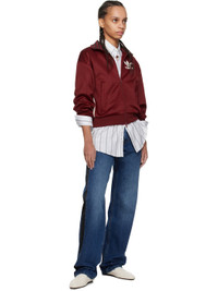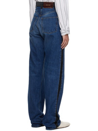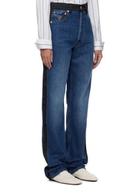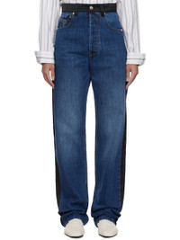 Paneled non-stretch denim and polyester satin jeans. Fading throughout. · Belt loops · Five-pocket styling · Button fly · Logo embroidered at coin pocket · Croc-embossed leather logo patch at back waistband · Logo-engraved antiqued gold-tone hardware · Contrast stitching in tan Supplier color: Indigo Body: 100% cotton. Body 2: 100% polyester. Made in Portugal 251752F069002