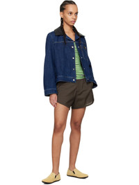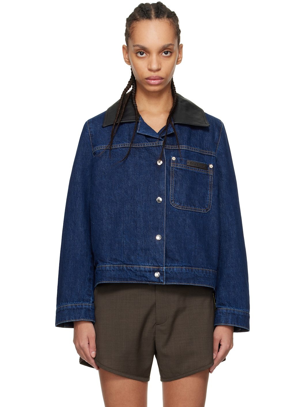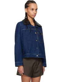 Non-stretch denim jacket. · Leather notched lapel · Press-stud closure · Leather logo patch at patch pocket · Seam pockets · Single-press-stud barrel cuffs · Full twill lining Supplier color: Indigo Body 1: 100% cotton. Body 2: 100% cow leather. Trim: 100% cow leather. Lining: 100% cotton. Made in Portugal 251752F060000