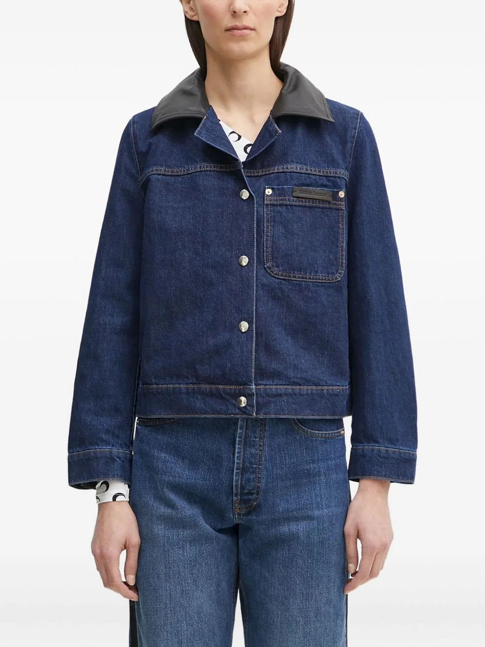 leather-collar denim jacket Highlights - Indigo blue - Leather collar - Button fastening - Chest pocket - Welt pockets - Long sleeves Imported Composition Calf Leather 100%, Cotton 100% Washing instructions Read Manufacturer Guidelines