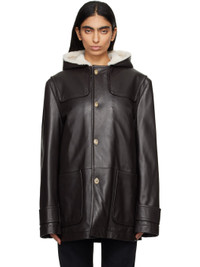 Paneled nappa sheepskin jacket. · Shearling trim at hood and placket · Turn-lock closure · Patch pockets · Turn-lock tab at cuffs · Patch pocket at interior · Full quilted lining Supplier color: Brown Body: 100% sheepskin. Lining: 100% polyester. Made in Italy 242752F064001