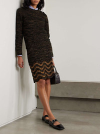 EDITORS'NOTES Wales Bonner's 'Chord' skirt is knitted with plenty of wool, cotton and linen in a melange of brown and black threads. Designed to hug your curves, it has a contrasting wavy pattern that mimics the scalloped hem. Complete the set with the matching sweater. SIZE & FIT Model measurements: - Fits true to size, however those who are between sizes should take the smaller size - Knee-length, designed to be worn just below the natural waist - Elasticated at the waist for a flexible fit - Mid-weight knit - Model is 175cm/ 5'9" and is wearing a size XSmall - Bust: 81cm/ 32" - Waist: 64cm/ 25" - Hip: 89cm/ 35" DETAILS & CARE - Light-brown and black wool, cotton, linen and nylon-blend - Slips on - 45% wool, 36% cotton, 13% linen, 6% nylon - Hand wash or dry clean
