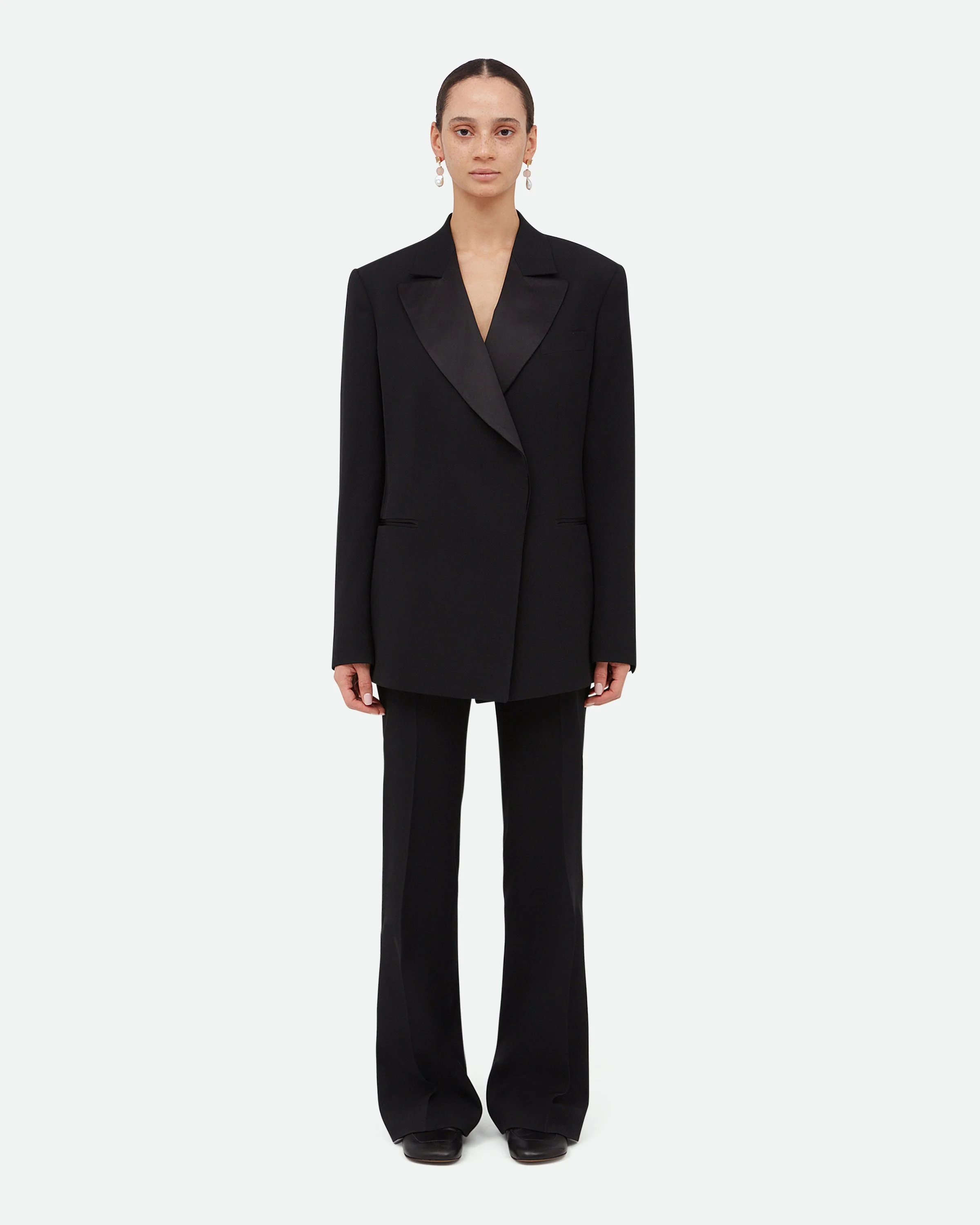 The Harmony Blazer Signature women’s wrap tuxedo silhouette with satin peak lapels and irregular cuff buttons in gold-plated brass and mother of pearl. - Black Satin Contrast - Made in Italy - 100% Wool Grain de Poudre
