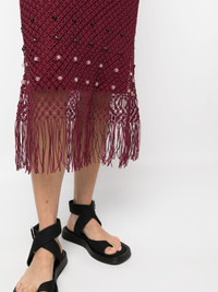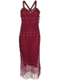 Java macrame fringed dress Ghanaian wood and glass beads are handwoven into the macrame construction of the Java dress, evocative of Wales Bonner's seamless blend of craftsmanship and modernity. Falling into a fringed straight silhouette, this oxblood-hued piece benefits from a detachable slip dress underlay. Highlights - Oxblood red - Cotton - Macrame detailing - Sleeveless - V-neck - Crossover shoulder straps - Bead embellishment - Fringe detailing - Mid-calf length Imported Composition Outer: Cotton 100% Lining: Cotton 100% SIZE & FIT Model measurements Height 5 ft 11 in(1.8 m) Bust/Chest 33.07 in(84 cm) Hips 37.4 in(95 cm) Waist 25.19 in(64 cm) FittingInformation Designed for a slim fit that sits just away from the body offering a close yet comfortable fit Made from a midweight non-stretch fabric This piece fits true to size – take your usual size Measurement LENGTH 50.39 in(128 cm) WAIST 25.98 in(66 cm) BUST 26.77 in(68 cm) Washing instructions Dry Clean Only