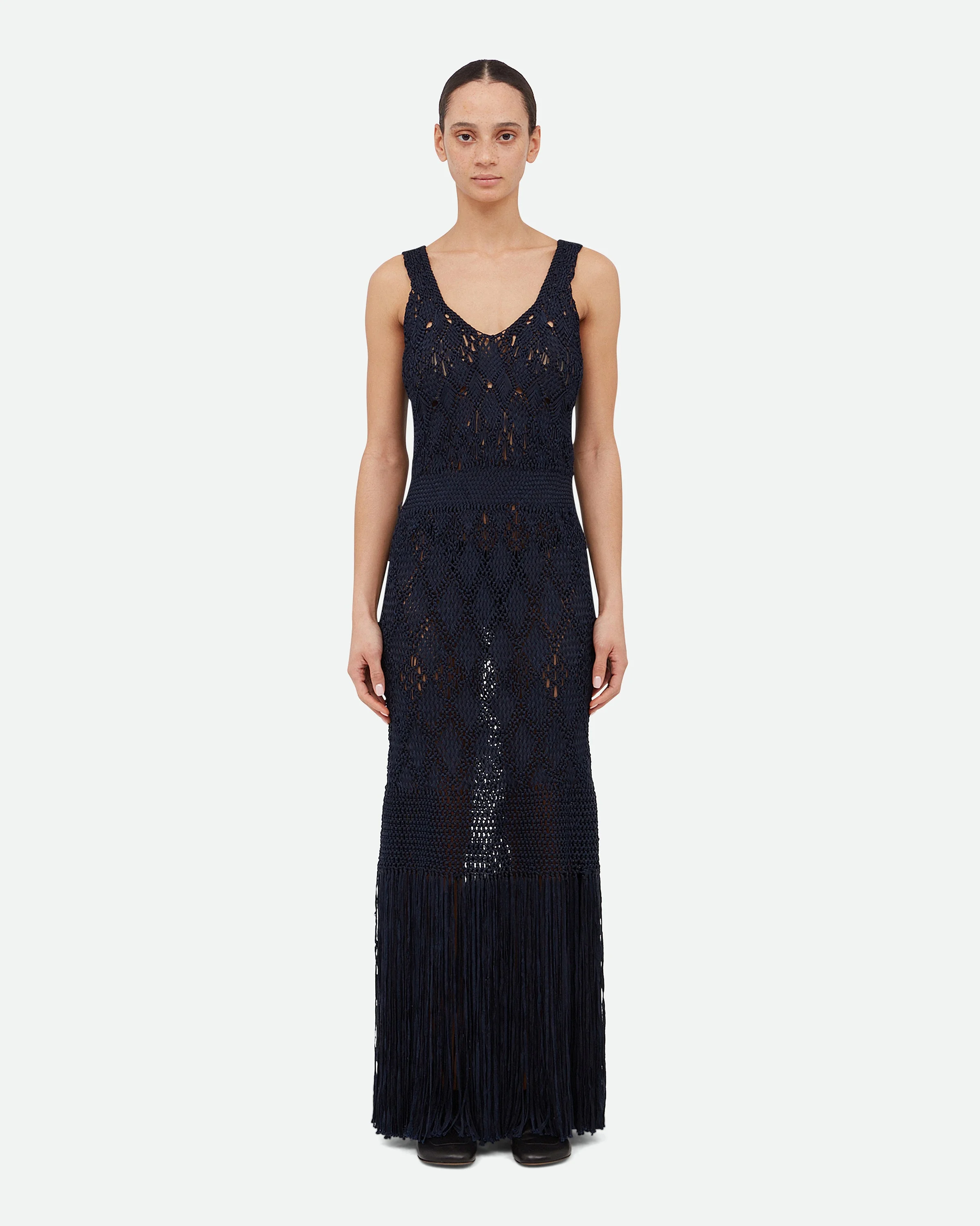 The Java Macrame Dress Intricate macrame dress handcrafted in India with a fringed hem and contrast weave at the waist. Each garment is a singular expression of artisanal ritual and care. Subtle variations in fit and texture reflect the character of its craft. Size down for a more fitted silhouette. - V Neck - Made in India - 100% Viscose