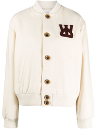 logo-appliqué bomber jacket from Wales Bonner featuring ivory white, burgundy, wool blend, appliqué logo, baseball collar, front button fastening, drop shoulder, long sleeves, two side welt pockets and ribbed trim. Size & Fit Model Measurements: Bust: 0cm Height: 0cm Hips: 0cm Waist: 0cm Fabric and Care Designer Style ID: WA23JA05WO07 Designer Colour: 100 IVORY Composition: Outer: Polyamide 20%, Wool 80%; Lining: Polyester 100%, Viscose 100% Washing instructions: Dry Clean Only Made in Tunisia