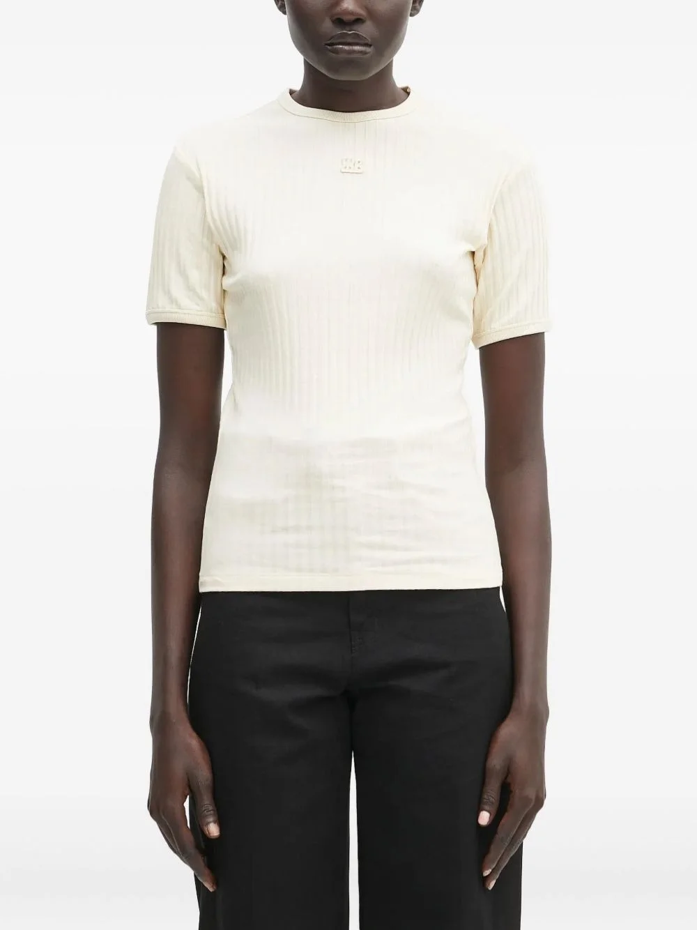 ribbed logo-patch top Highlights - Off-white - Short sleeves - Ribbed texture - Round neck - Logo patch Imported Composition Viscose 95%, Elastane 5% Washing instructions Read Manufacturer Guidelines