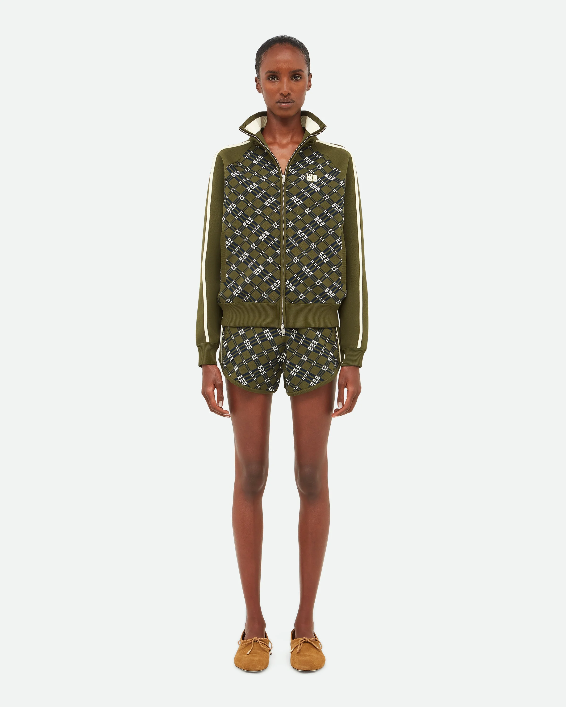 A unisex top crafted in poly check knit, presented in khaki and navy. Composition:100%Polyester