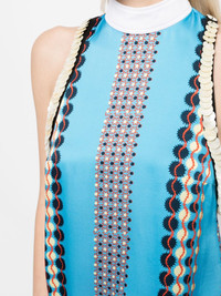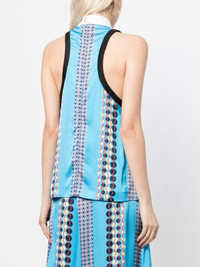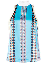 sleeveless satin printed top This top by the English brand Wales Bonner is defined by a geometric pattern that delineates the silhouette with curvy motifs. Featuring a stand-up collar and sequin detailing, this piece is enhanced by details. Highlights - Blue - Satin finish - All-over graphic print - Stand-up collar - Sleeveless - Sequin detailing - Straight hem Imported Composition Viscose 100% SIZE & FIT Model measurements Height 5 ft 9 in(1.76 m) Bust/Chest 31.1 in(79 cm) Hips 35.03 in(89 cm) Waist 24.4 in(62 cm) FittingInformation Designed to be unstructured, offering a loose fit throughout Constructed with a narrow neckline Made from a midweight non-stretch fabric This piece fits true to size – take your usual size Washing instructions Machine Wash