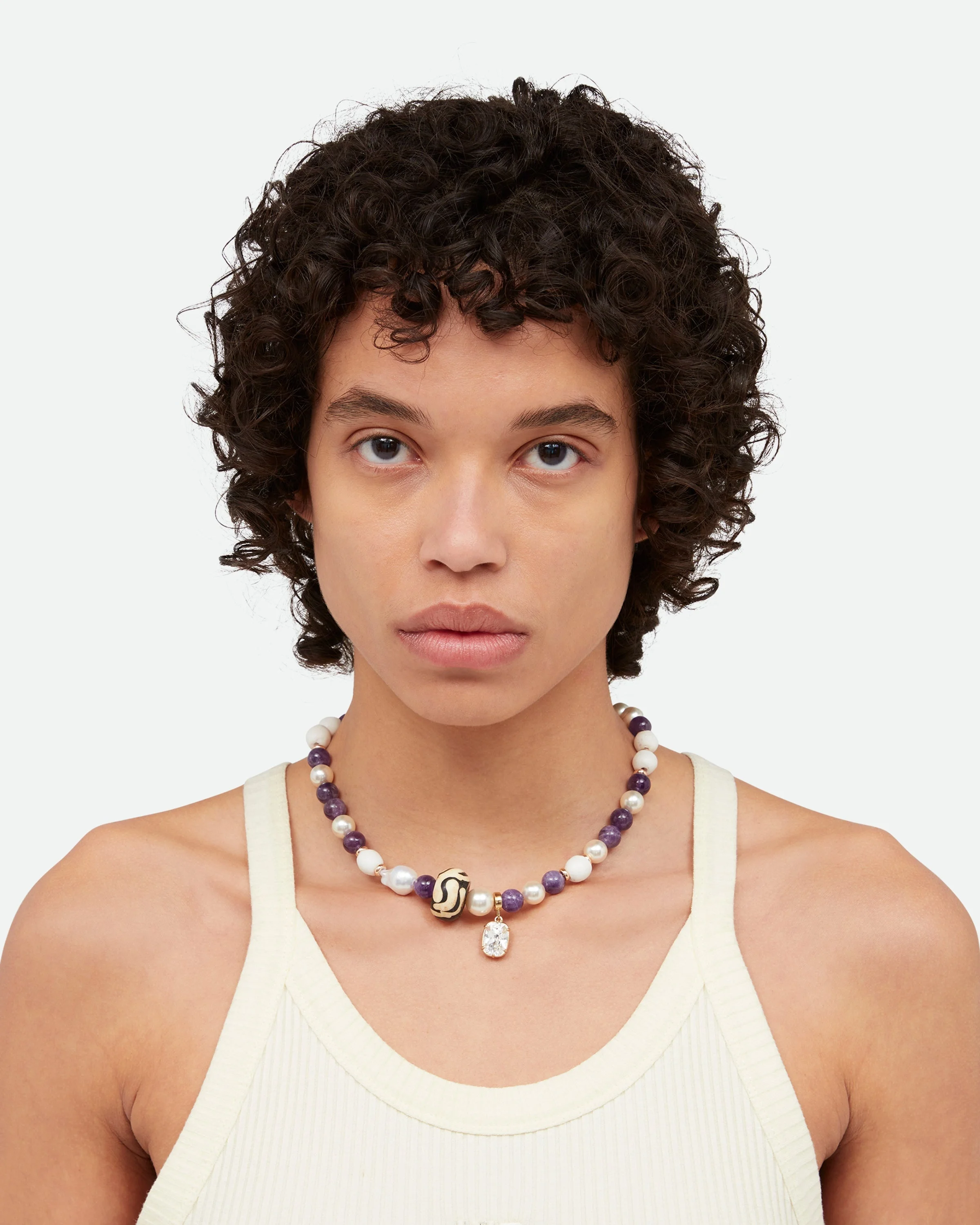 This seasonal iteration of the Story Necklace is crafted from recycled glass beads made in Ghana, gold-plated rondelle spacers, and freshwater pearls. The design is accentuated by a Batik bone bead made in Kenya and a Swarovski Quartz crystal. - Logo-Embossed Closure - Artisanal Beads - Made in Italy