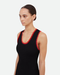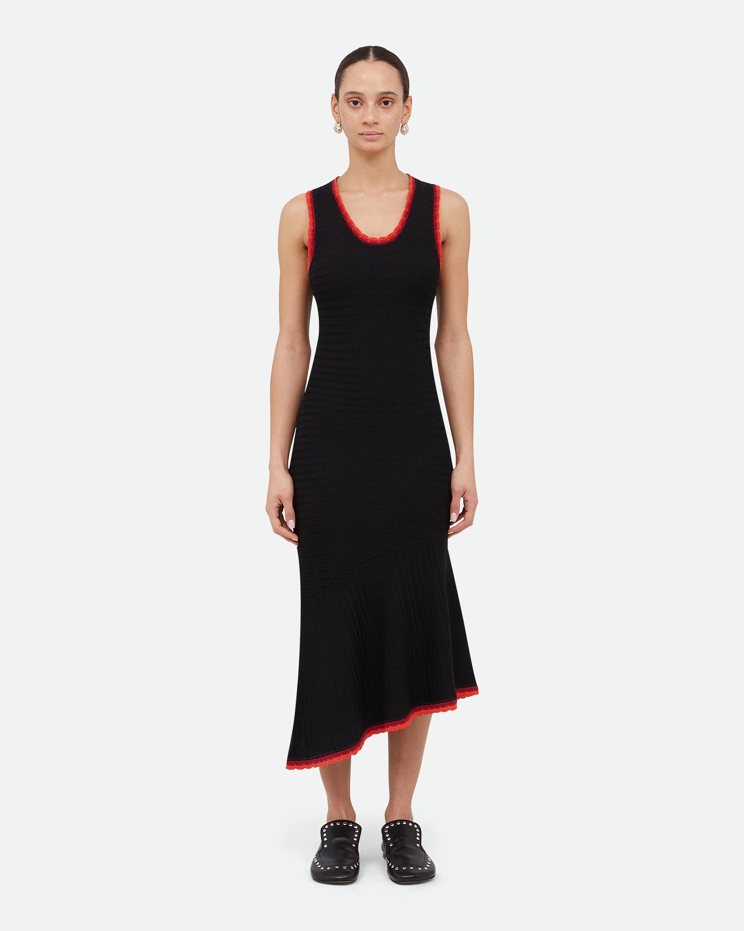 Sun Knit Dress Subtle chevron knit dress with an open back silhouette and contrast two-tone trim. - Asymmetric Hem - Chevron Knit Pattern - 65% Viscose, 35% Nylon