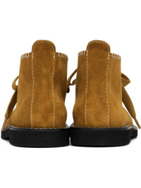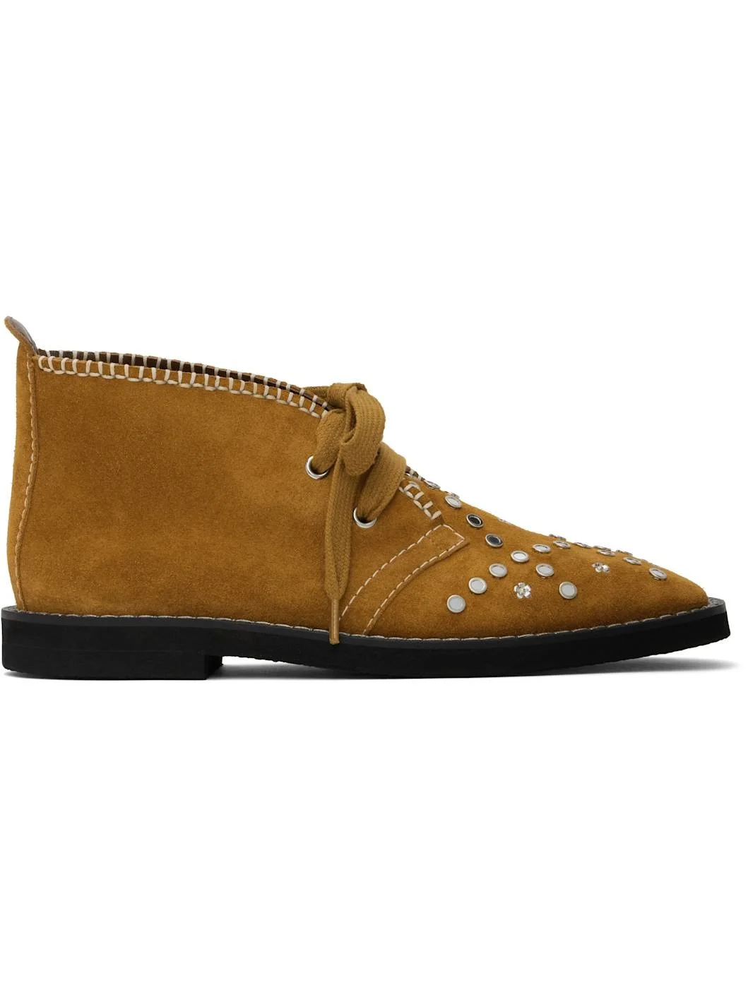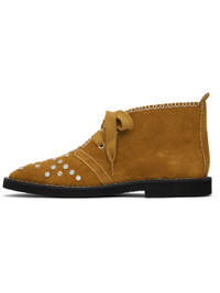 Ankle-high calfskin suede boots in tan. · Square toe · Studded detailing at vamp · Lace-up closure · Logo embossed at tongue · Whipstitching at collar and welt · Pull-tab at heel collar · Buffed calfskin lining · Textured rubber sole · Contrast stitching in white Supplier color: Tan Upper: calfskin. Sole: rubber. Made in Italy 242752F113001