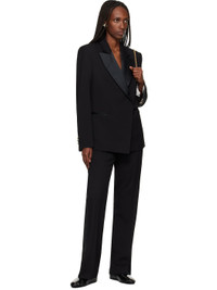 Virgin wool barathea blazer. · Sateen trim at peaked lapel · Button closure · Welt pockets at front · Padded shoulders · Graphic hardware at surgeon's cuffs · Welt pocket at interior · Full satin lining · Gold-tone and horn hardware Supplier color: Black Body: 100% virgin wool. Trim: 100% polyester. Lining 1: 100% viscose. Lining 2: 58% acetate, 42% cupro. Made in Italy 252752F057000