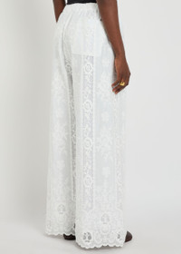 Info & Care Wales Bonner cotton trousers Floral embroidery, elasticated waistband, back patch pocket, lacework inserts, scalloped cuffs, fully lined Pull on 100% cotton Hand wash Size & Fit Inside leg length: 31 inches/ 79cm Midweight Wide-leg cut Model is 5'9"/ 175cm and wears a size IT40
