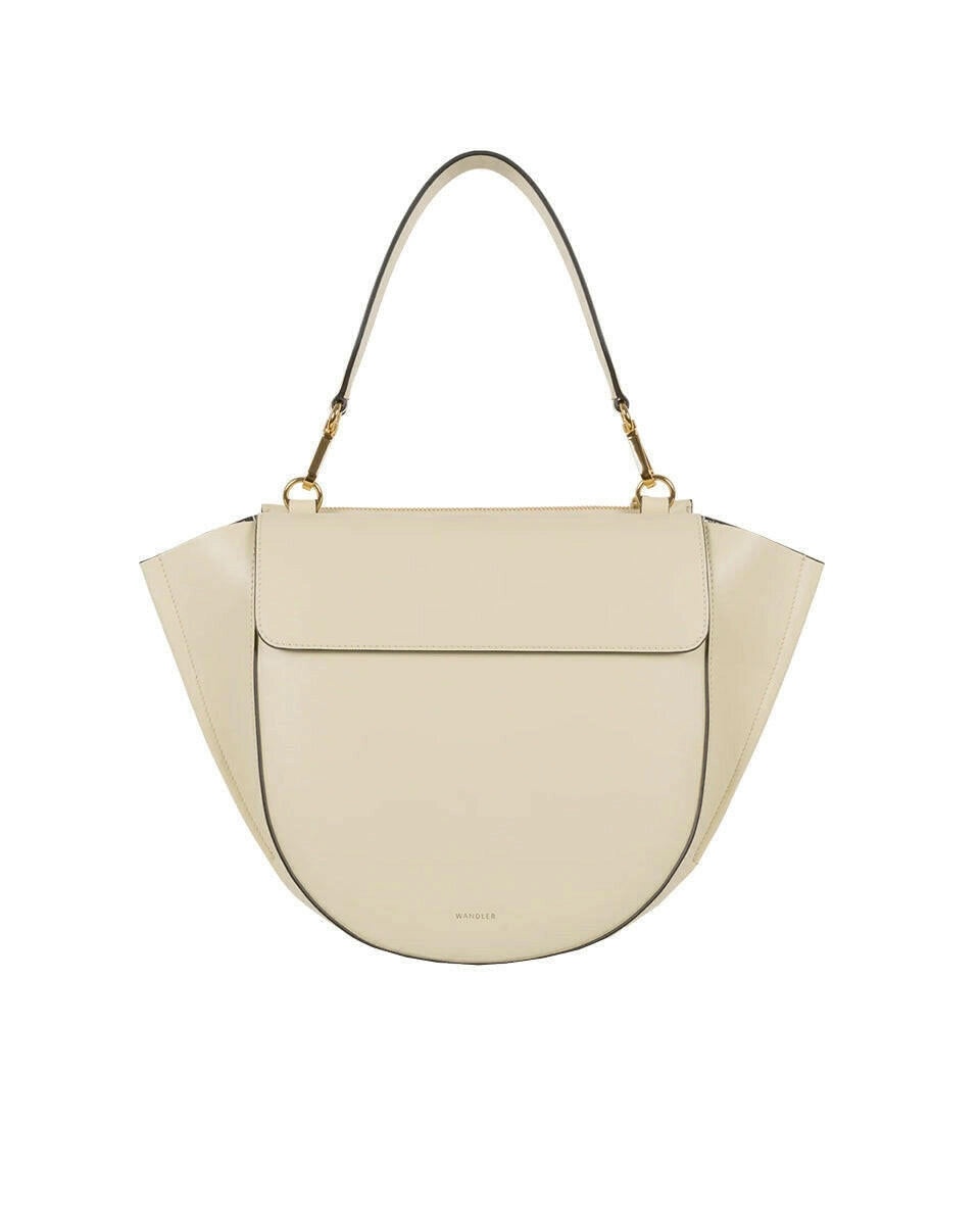 FINAL SALE The Hortensia Bag Medium in Shell by Wandler is a versatile, roomy purse featuring an outside pocket, optional long strap, and gold hardware. - Height: 24cm - Width: 37cm - Depth: 7cm - Made in Italy - All leather is EU reach compliant (REACH) - Calf leather is tanned at a LWG certified partner