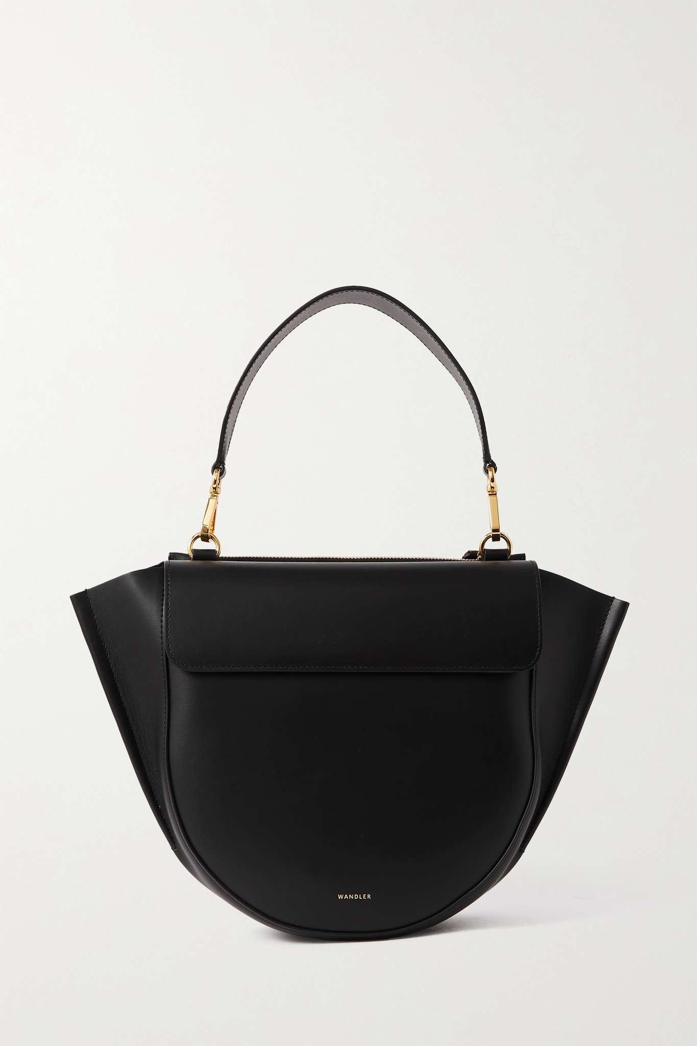 EDITORS'NOTES Wandler's bags are made by small family-owned factories in Portugal and Italy that use traditional techniques. This 'Hortensia' tote is cut from smooth black leather with expanding side panels and a structured, curved base. It opens up to a spacious interior with zipped and slip pockets, and can be carried by the short handle or longer cross-body strap. SIZE & FIT This item’s measurements are: - Min. Strap Length: 100cm / 39.4in - Handle Drop: 17cm / 6.7in - Depth: 8cm / 3.1in - Max. Strap Length: 110cm / 43.3in - Height: 24cm / 9.4in - Width: 37cm / 14.6in DETAILS & CARE - Black and gold leather (Calf) - Magnetic-fastening front flap - Weighs approximately 2.9lbs/ 1.3kg