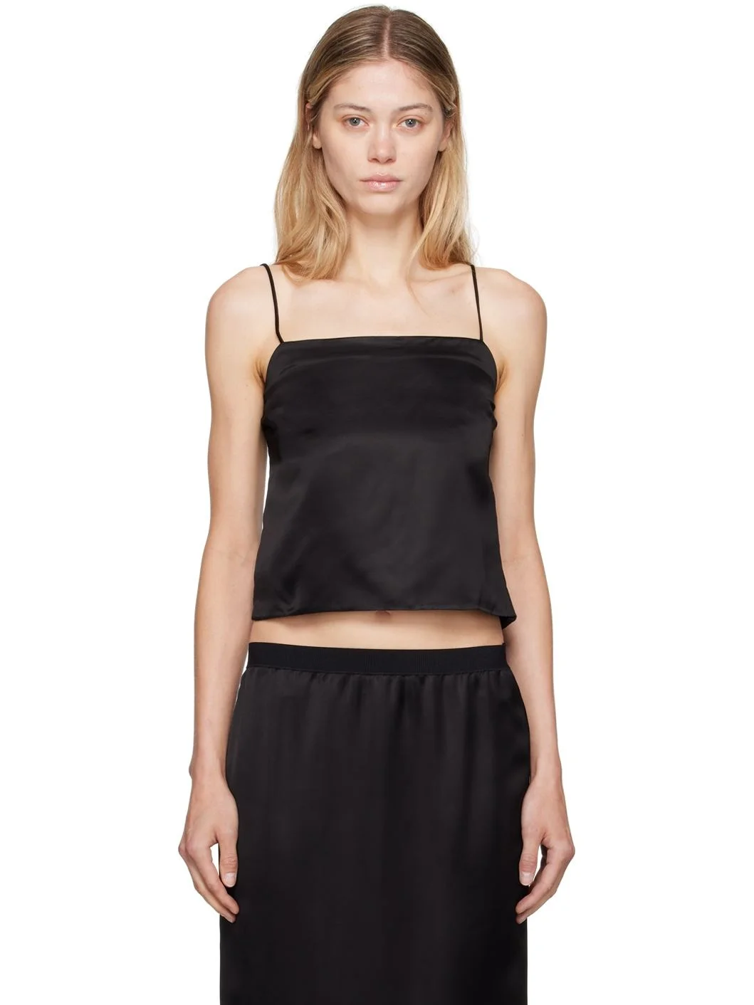 Viscose satin camisole. · Square neck · Darts at chest · Cropped hem · Spaghetti straps Supplier color: Black 100% viscose. Made in Madagascar 242277F111014