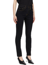 Tapered denim jeans in black. · High-rise · Five-pocket styling · Belt loops at waistband · Button-fly · Bronze-tone and black hardware Supplier color: Black 100% cotton. Made in United States 221277F069001