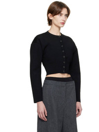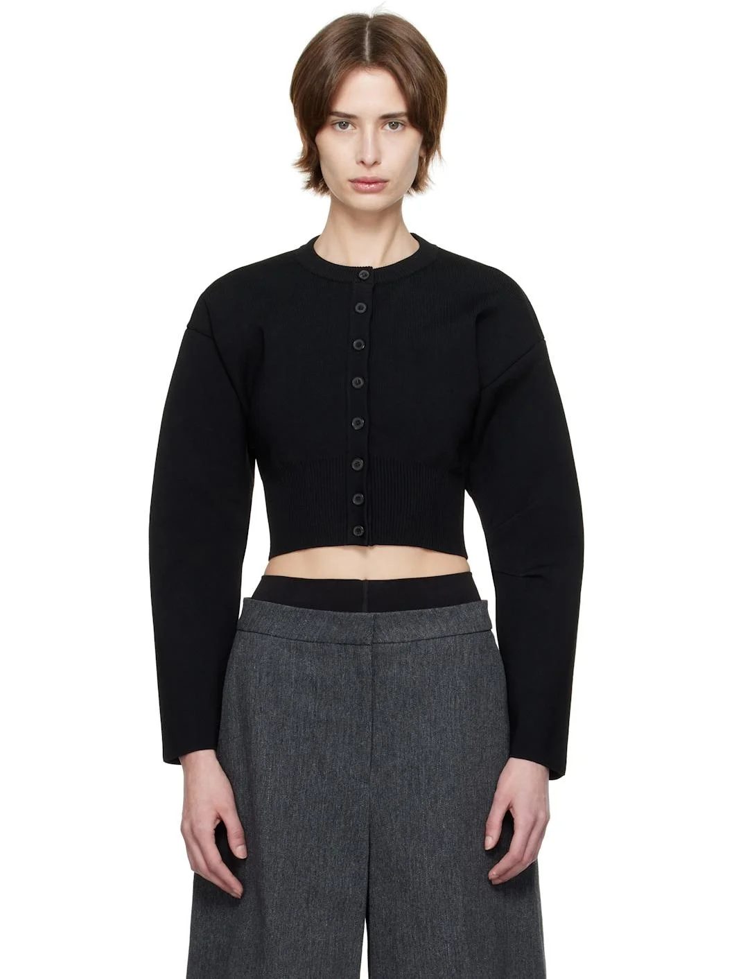 Rib-knit viscose-blend cardigan. · Crewneck · Button closure · Cropped hem · Dropped shoulders · Pleats at sleeves Supplier color: Black 83% viscose, 17% polyester. Made in Italy 251277F095000