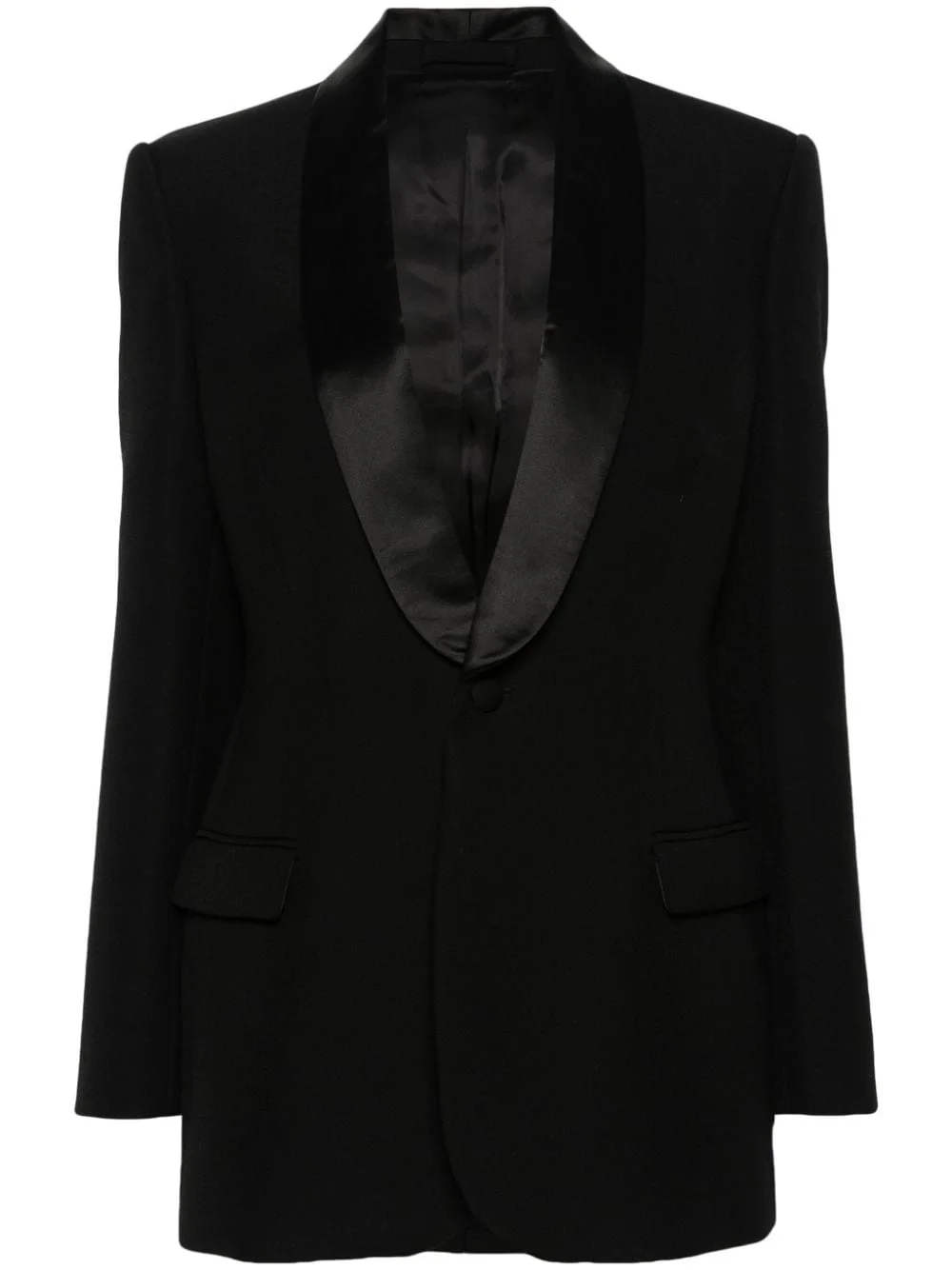 single-breasted wool blazer WARDROBE. NYC’s mission is to create staple wardrobe essentials, like this black tuxedo blazer. It’s tailored from black wool to a single-breasted silhouette and framed with satin shawl lapels, recalling traditional styles. Highlights - Black - Virgin wool - Satin trim - Fabric-covered buttons - Shawl lapels - Shoulder pads - Long sleeves - Buttoned cuffs - Two front flap pockets - Internal jetted pocket - Internal logo tag - Satin lining - Front button fastening Imported Composition Outer: Virgin Wool 100% Lining: Viscose 100% SIZE & FIT FittingInformation Designed for a slim fit that sits just away from the body offering a close yet comfortable fit The internal shoulder pads offer a structured shape Made from a midweight non-stretch fabric